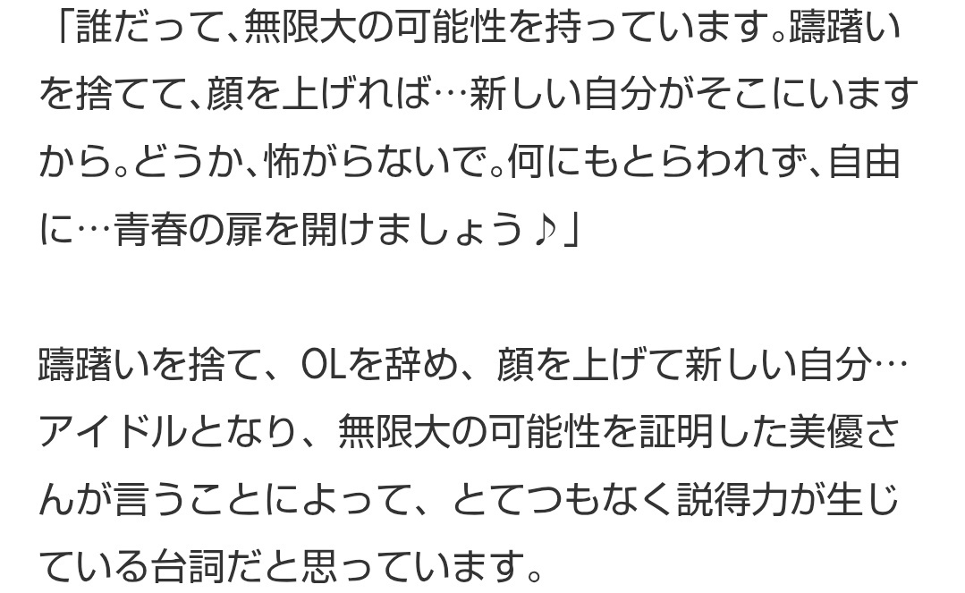 原田さんがアイマスの好きなところに挙げた「無限の可能性」 これって実は成人アイドルたちの存在にも関わってくる話だと思ってまして 画像はモバマスにあった美優さんのカードの台詞についてです。 なお、ギャル女子高生のコスプレしながらこんなこと言ってます… #アイに行きマス成田 pic.x.com/8sztTamkpW