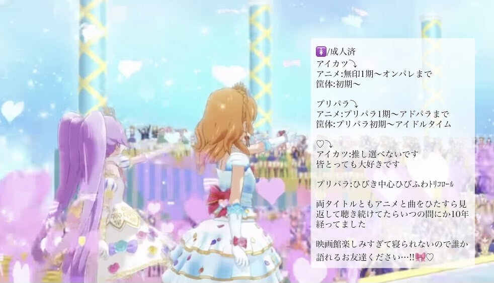 アイカツ!×プリパラの映画公開記念にお友達探し𝜗𝜚 ˗ˏˋ lit.link/tag_Tyrolean ˎˊ˗ リンク先とALT確認いただけますと幸いです ♡ or RPでお迎えさせていただきます♪ #アイカツ好きさんと繋がりたい #プリパラ好きさんと繋がりたい