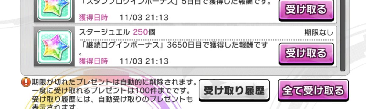 デレステをプレイして10年が経過しました!そして10周年おめでとう(((o(*゚▽゚*)o))) ちくしょう!いつもの癖で 受け取りプレゼントスキップしてもうた! #デレステ #アイドルマスターシンデレラガールズスターライトステージ #アイドルマスター pic.x.com/xNQsscnbBp