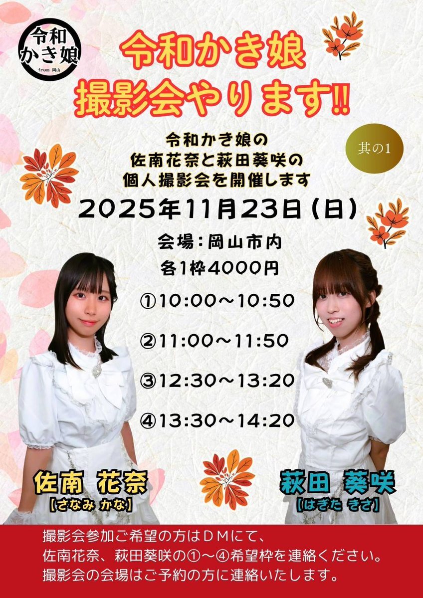 【令和かき娘撮影会】 令和かき娘の佐南花奈と萩田葵咲の個人撮影会を行います😄 2025年11月23日(日) 会場:岡山市内 2人それぞれ1枠4000円 ①10:00〜10:50 ②11:00〜11:50 ③12:30〜13:20 ④13:30〜14:20 ご希望枠をDMにてお願いします🙇