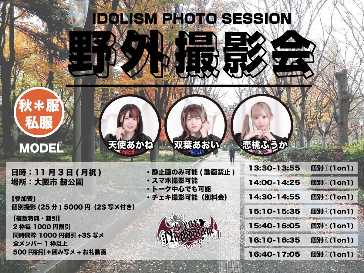 【#ディアメアイベント情報】 11/3(月祝) 「IDOLISM PHOTO SESSION📷野外撮影会」 📍靱公園 ✔️詳細は画像参照 参加⏩tiget.net/events/440075 ※10/30(木)20:00予約開始 ※クレジット支払い可能 #ディアメア  #撮影会 #アイドル撮影会 #野外撮影会 #集まれ一眼レフ好き #アイドル #IDOL