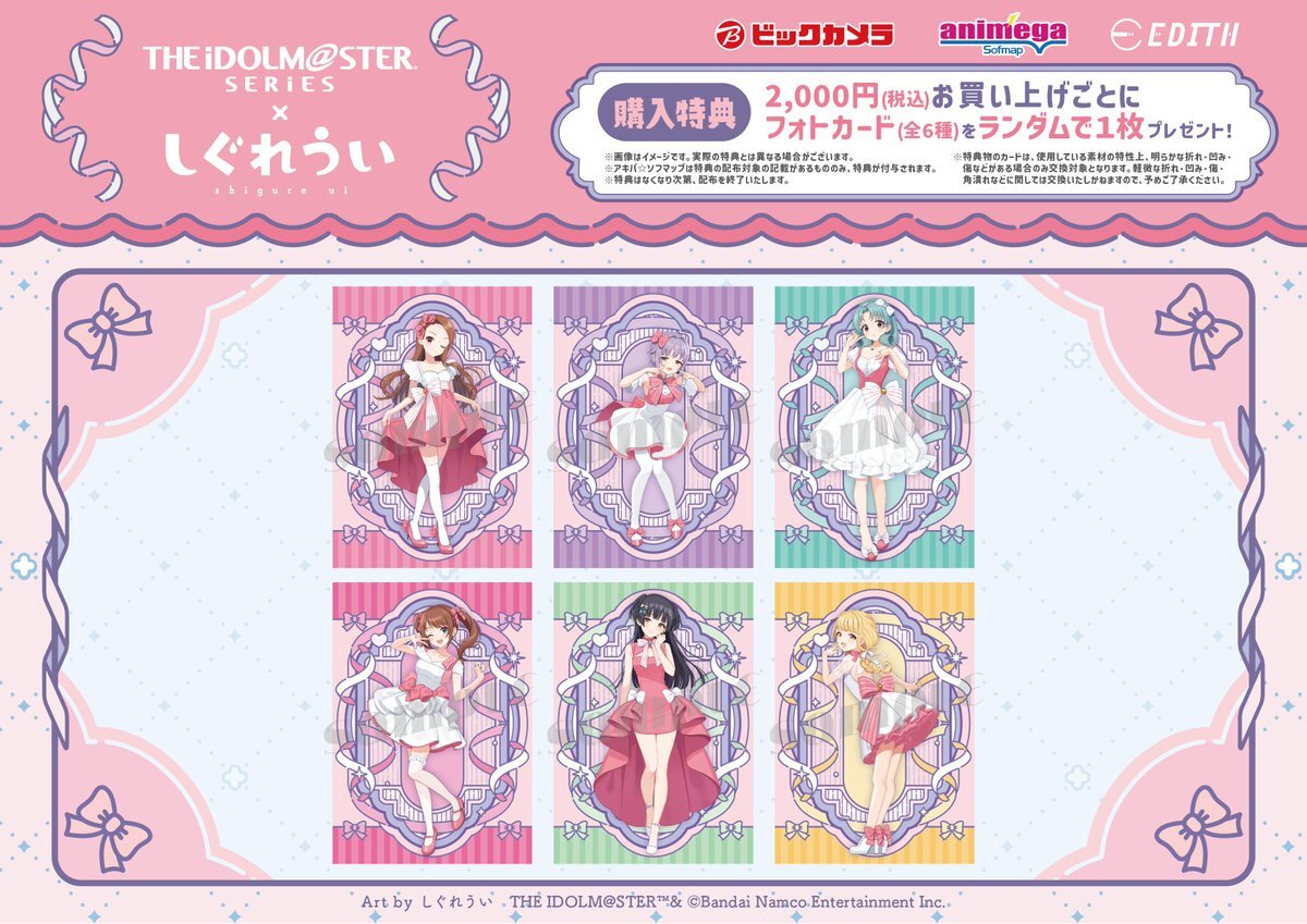 // 🗣️ 『アイドルマスター』シリーズ×しぐれうい 購入者限定特典🎁 \\ こちら該当商品を2,000円(税込)以上ご購入のお客様には、 全6種展開の「フォトカード」をプレゼント💫 ぜひ、チェックしてくださいね🙌 @imas_official #idolmaster #アイマスしぐれういコラボ pic.x.com/dgiRWs6R45
