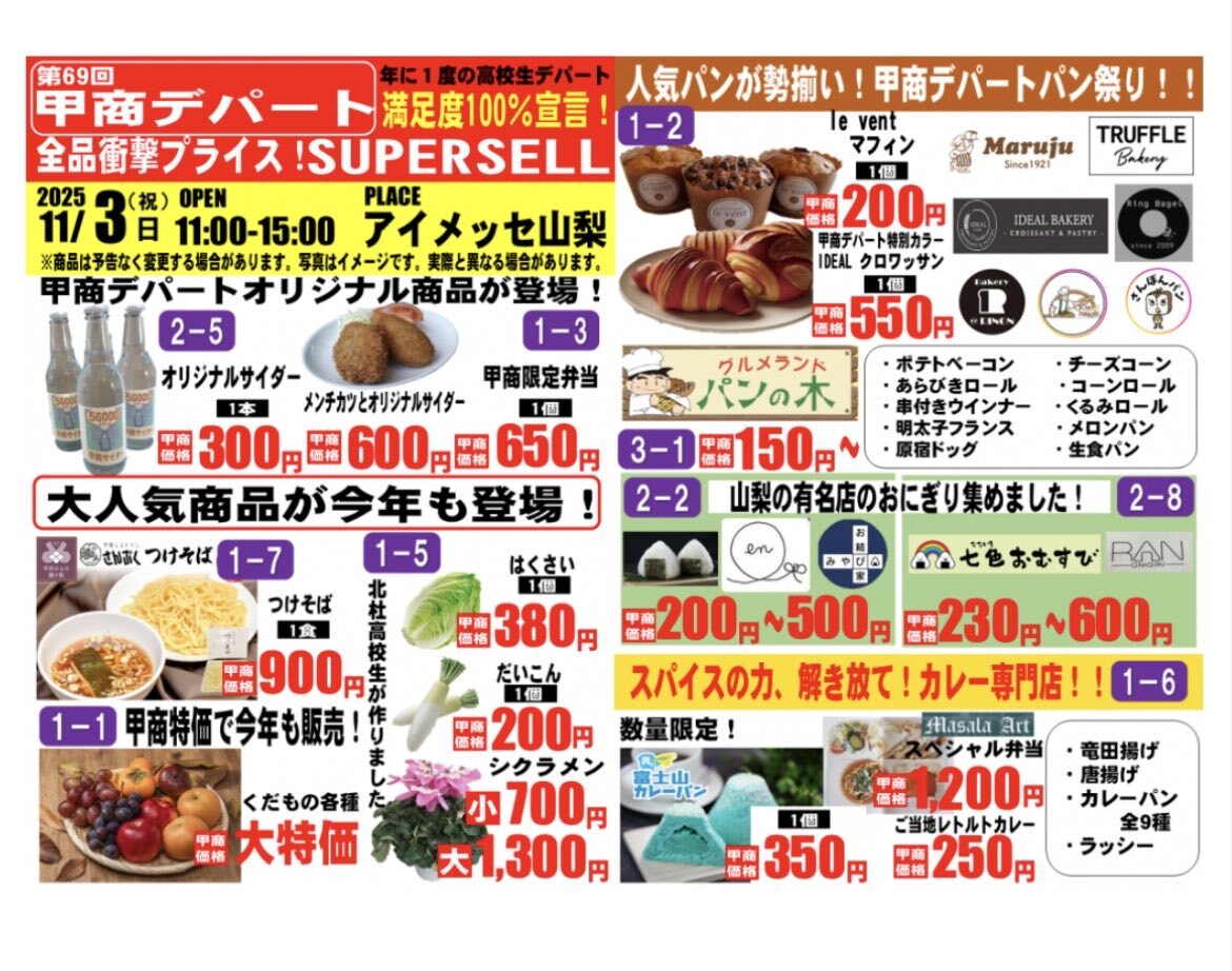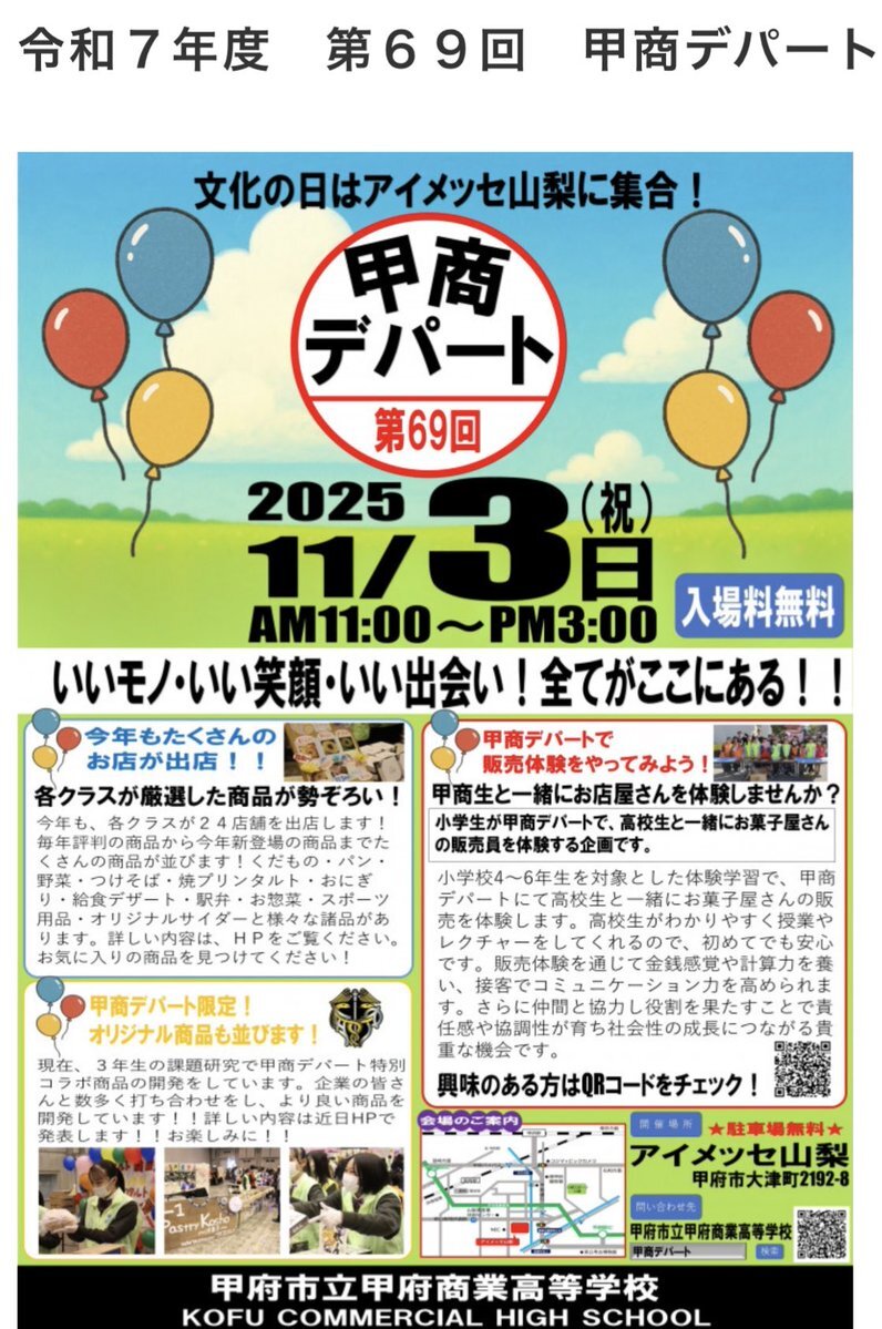 第69回「甲商デパート」開催 高校生たちが日々の学びを活かして、実践販売に挑戦します✨ 場所:アイメッセ山梨 日程:11月3日(祝・月) 時間:11:00~15:00 入場無料 小麦の奴隷甲斐店の商品も販売していただきます🥐🔥 ぜひ応援しに来てください! #小麦の奴隷 #甲商デパート #アイメッセ山梨 pic.x.com/JE7Lu3cYym