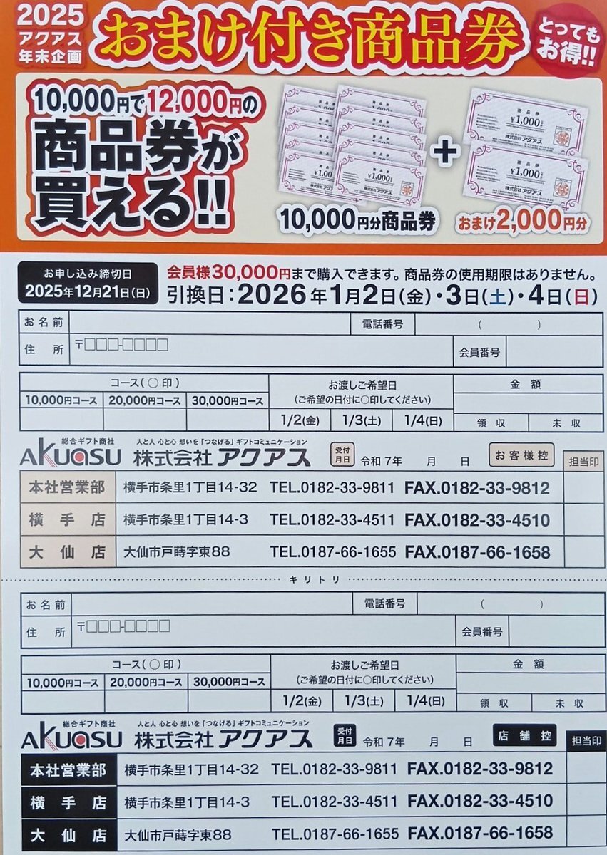 \\📣おまけ付き商品券の販売が始まりました📣// 年に2回だけの期間限定販売です☺️20%多く戻った分でお得にお買い物しませんか😘この機会に是非一度どうぞ🙌 #アクアス横手店 #横手市 #商品券 pic.x.com/G8lYkd3jp7