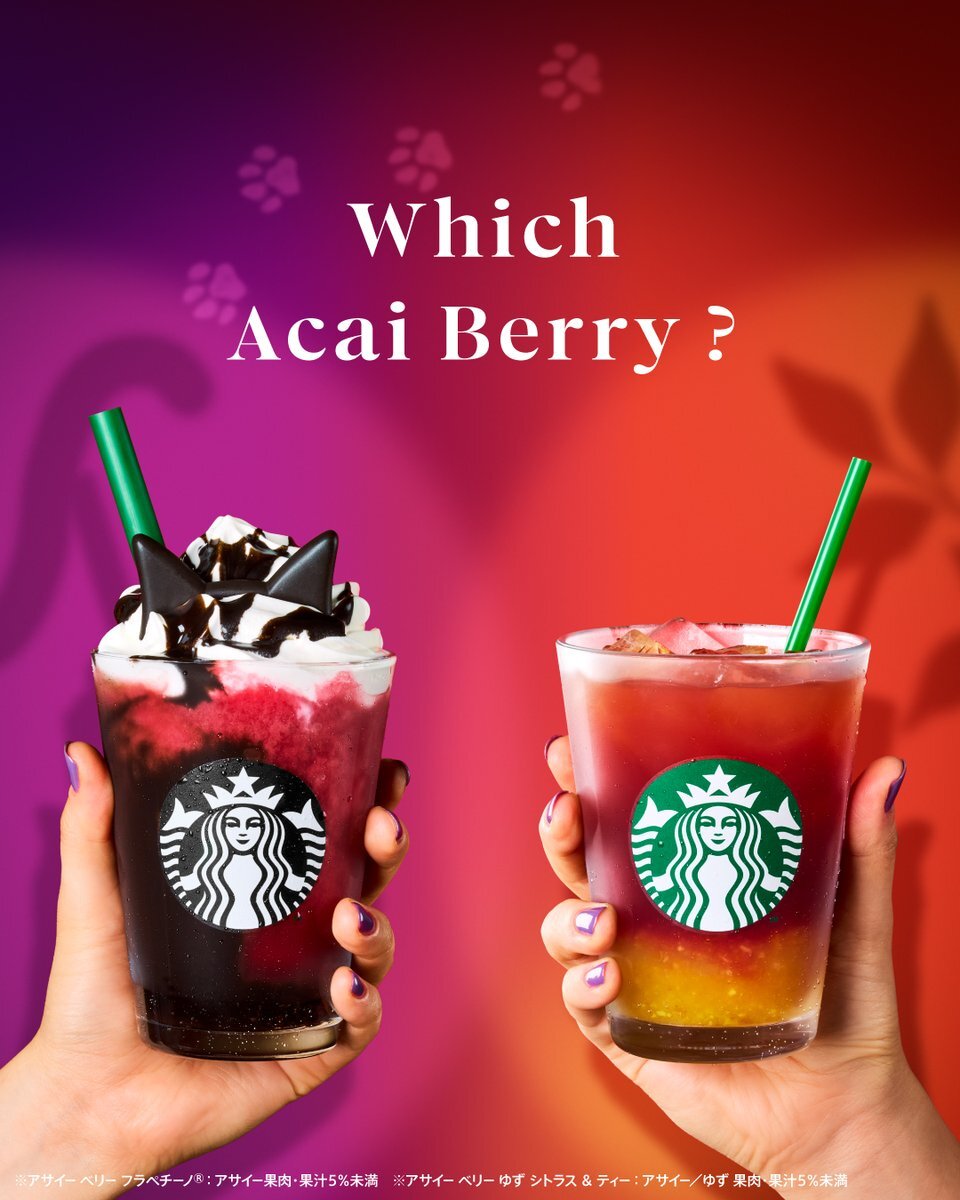 甘酸っぱいアサイーベリーがアクセントの一杯、みなさんはどちらで楽しみたいですか?🌗🐈⬛ 🖤→ #アサイーベリーフラペチーノ® ザクザク食感×甘酸っぱさに、見た目からもハロウィン気分を盛り上げる一杯 💜→ #アサイーベリーゆずシトラスandティー pic.x.com/tgCsqHmJPE