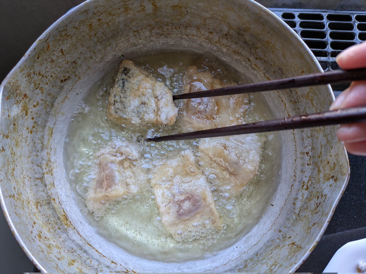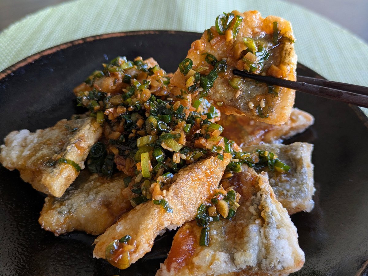 カリッジュワ、アジの竜田揚げ🐟✨ 市場で目利きさんに選んでもらった 新鮮なアジを竜田揚げに✨️ 香ばしい衣に ネギだれがじゅわっとしみて、 生姜のピリッとした アクセントが最高、、、! やっぱり市場の魚は格別です😋 #川崎幸市場 #三栄水産 #アジの竜田揚げ pic.x.com/8B6iQ3J7kd