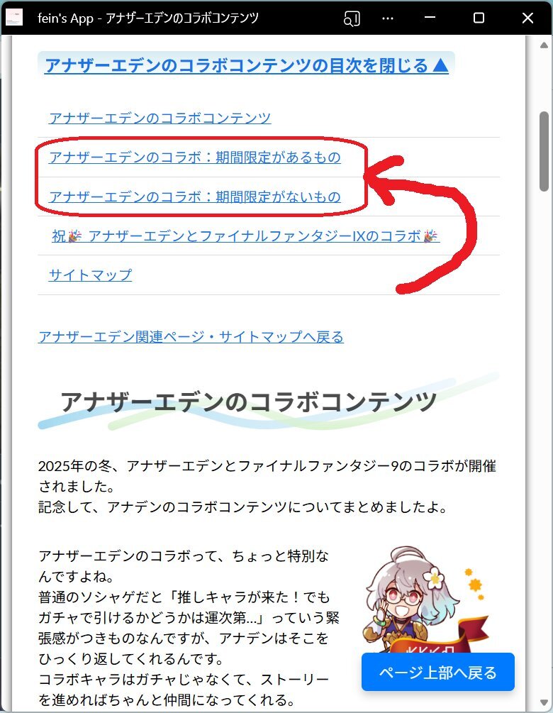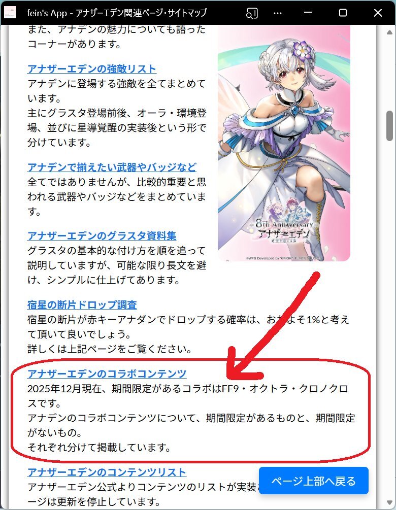 🔵アナザーエデンのコラボコンテンツ feinatelier.org/another-eden/a… 私がここらへん…落とすと思う? コンパクトなWebページを作りました コラボの中には期間限定モノもあるからね 仲間になるキャラ含め、綺麗に見やすく、まとめてあります🖊 #アナデンFF9コラボ #アナザーエデン pic.x.com/NcThQBMrne