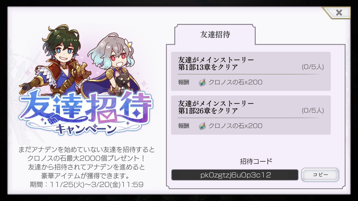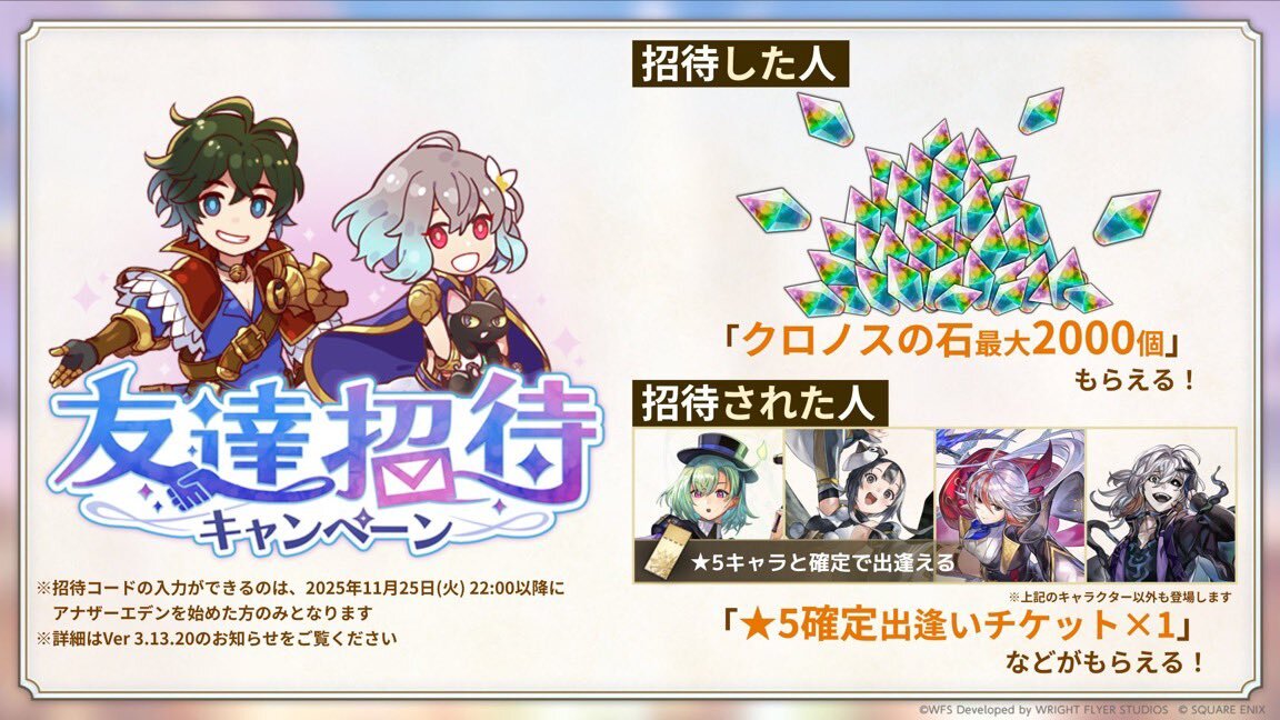 【友達招待キャンペーン】 招待した人はクロノスの石最大2000個、 招待された人は★5キャラクター確定出逢いチケットなどが入手可能! ※招待コードの入力は11月25日(火) 22:00以降にアナザーエデンを始めた方のみ可能です ※詳細はゲーム内お知らせをご覧ください #アナザーエデン
