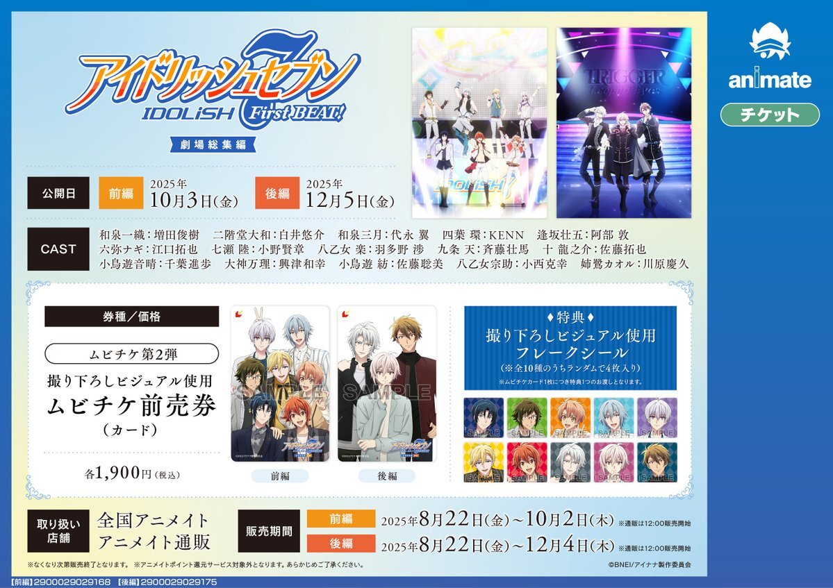 『アイドリッシュセブン First BEAT! 劇場総集編』 前編:10/3 後編:12/5 公開 ムビチケ第2弾は、【前編】IDOLiSH7【後編】TRIGGER の撮り下ろしビジュアルを使用✨ 特典は「撮り下ろしビジュアル使用フレークシール」です☆ ただいま大好評販売中サワ! #アニナナ総集編 pic.x.com/4jfBg60oQJ