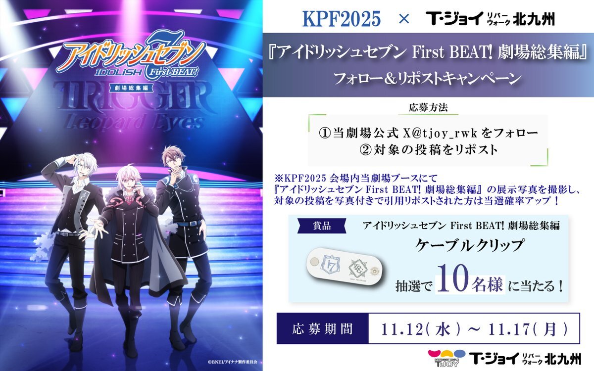 『#アイドリッシュセブン First BEAT! 劇場総集編 後編』 公開記念!抽選で作品オリジナルグッズが10名様に当たる🎁 【応募】  ①当劇場Xをフォロー ②この投稿をリポスト 締切:11/17まで #KPF2025 で #アニナナ総集編 の展示を撮影し、この投稿を写真付きで引用RPで当選確率UP! #TRIGGER