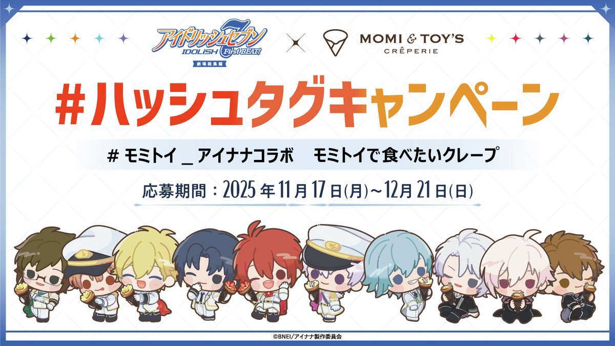 11/17(月)~販売開始!#モミトイ_アイナナコラボ 【Xハッシュタグキャンペーンのご紹介】 コラボクレープの販売を記念して、11/17~12/21までXにてハッシュタグキャンペーンを実施! 応募者の中から抽選で10名様にオリジナルクッションをプレゼントします🎁 開催期間:2025年11月17日~12月21日まで