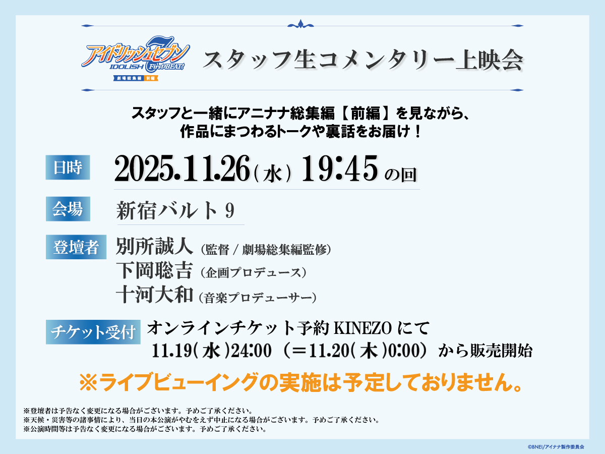 / このあと11/19(水)24:00からチケット発売! #アニナナ総集編 【前編】 スタッフ生コメンタリー上映会 \ 〇日時 11/26(水)19:45の回 〇場所 新宿バルト9 〇登壇者 別所誠人(監督)、下岡聡吉(企画プロデュース)、十河大和(音楽P) チケット→tjoy.jp/shinjuku_wald9 お見逃しなく! #アイナナ pic.x.com/BXC4ZmWrrL