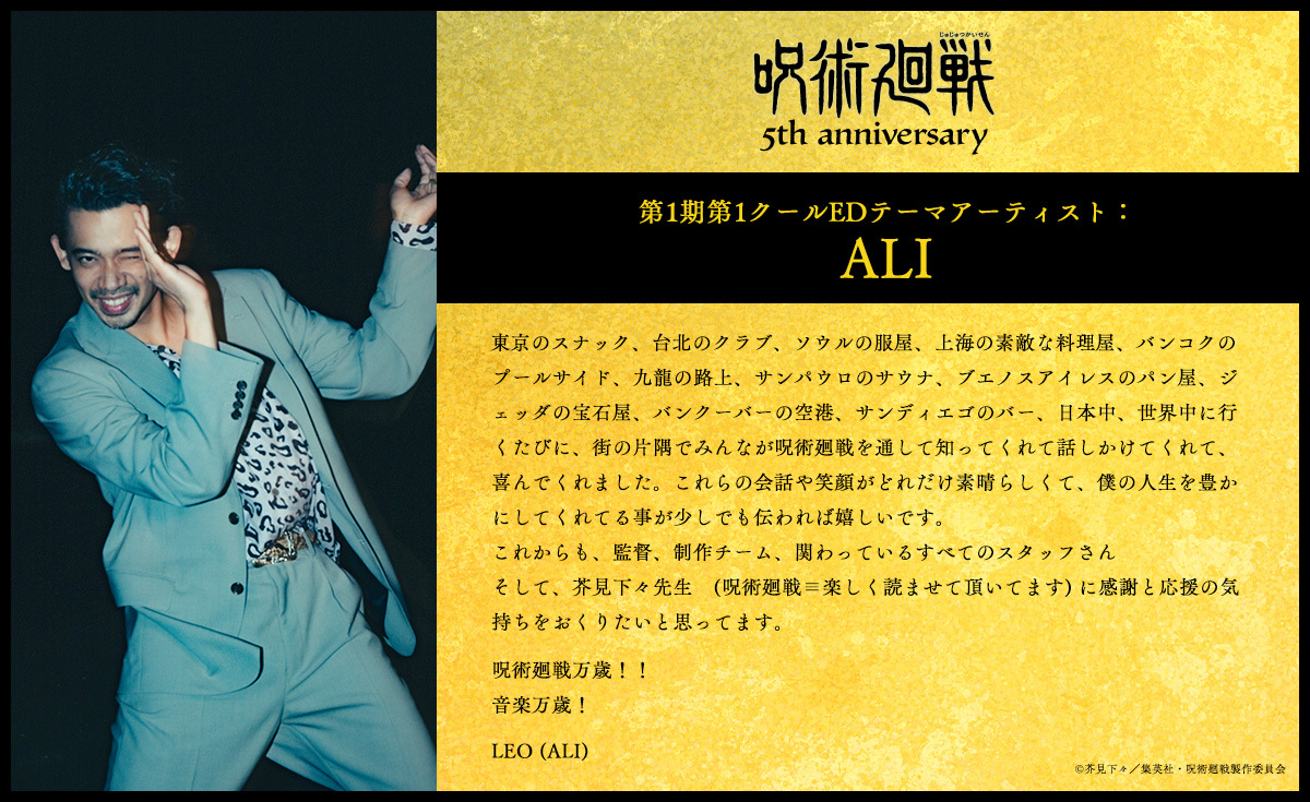 返信先:@oO0Eve0Oo◤ アニメ 『#呪術廻戦』 5周年お祝いコメント到着!! ◢ 5周年を記念して 第1期第1クールEDテーマアーティスト #ALI さんより お祝いコメントが到着!! #jujutsukaisen #アニメ呪術廻戦5周年