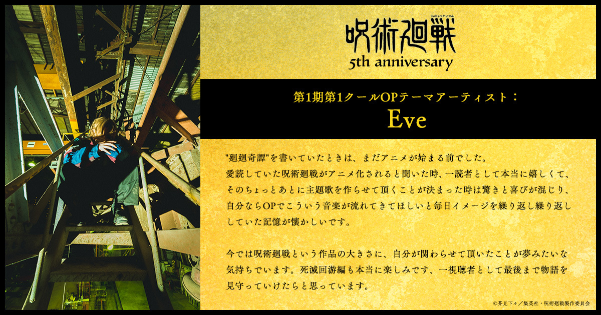 ◤ アニメ 『#呪術廻戦』 5周年お祝いコメント到着!! ◢ 5周年を記念して 第1期第1クールOPテーマアーティスト #Eve さんより お祝いコメントが到着!! #jujutsukaisen #アニメ呪術廻戦5周年 pic.x.com/VVanQgVZFd