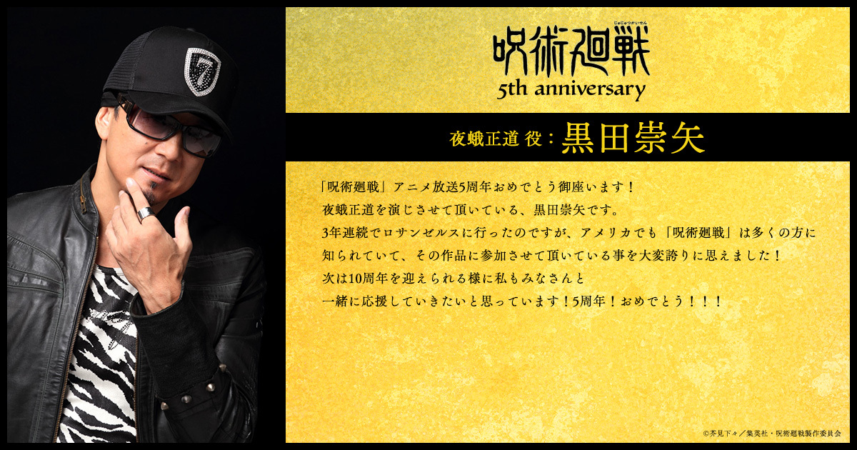 ◤ アニメ 『#呪術廻戦』 5周年お祝いコメント到着!! ◢ 5周年を記念して #夜蛾正道 役 #黒田崇矢 さんより お祝いコメントが到着!! #jujutsukaisen #アニメ呪術廻戦5周年 pic.x.com/nn7pLLUp0P