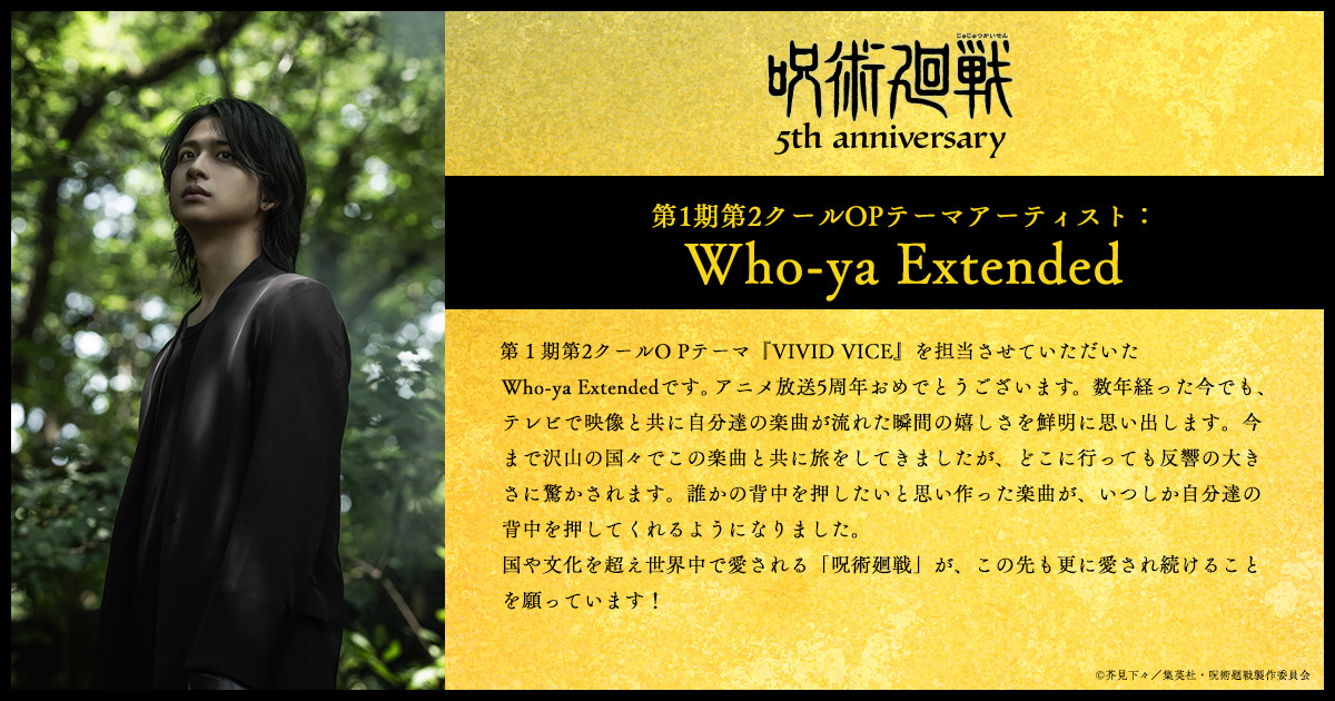返信先:@oO0Eve0Oo他1人◤ アニメ 『#呪術廻戦』 5周年お祝いコメント到着!! ◢ 5周年を記念して 第1期第2クールOPテーマアーティスト Who-ya Extended さんより お祝いコメントが到着!! #jujutsukaisen #アニメ呪術廻戦5周年 #wyxt pic.x.com/MRFc90vq1G