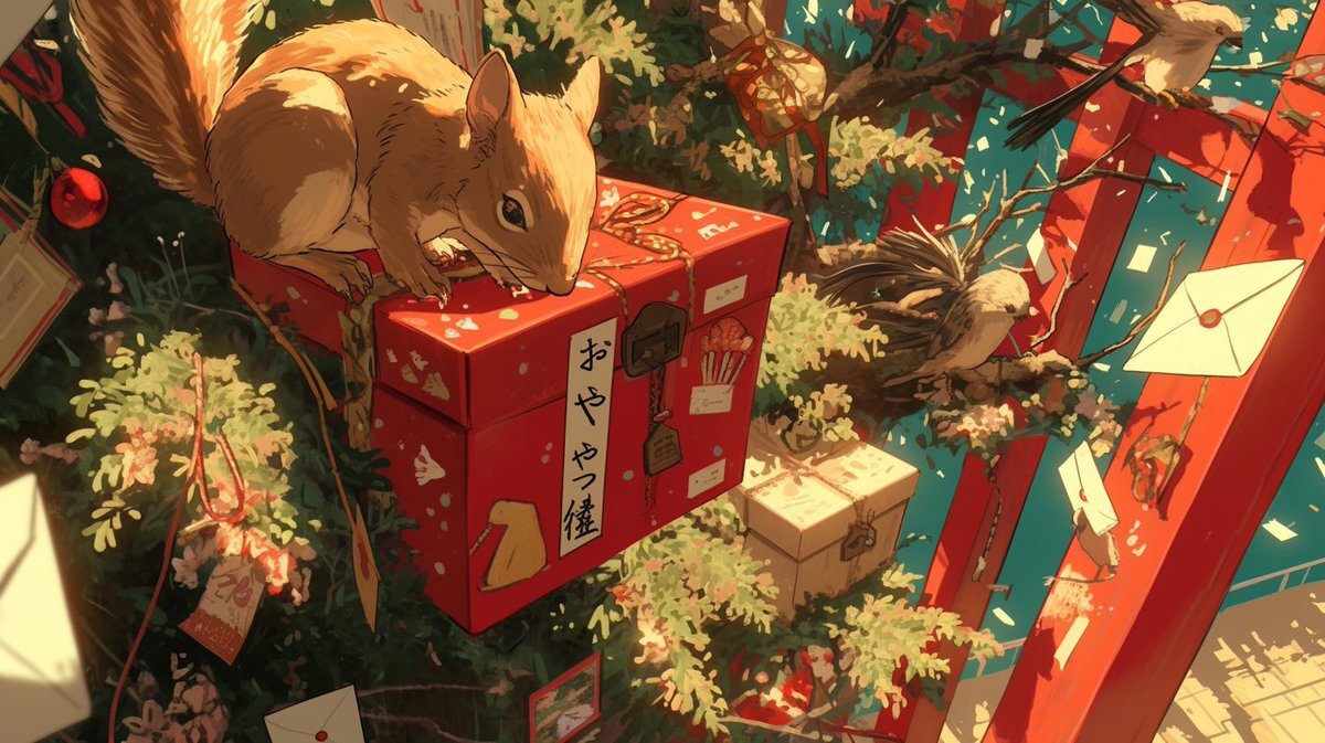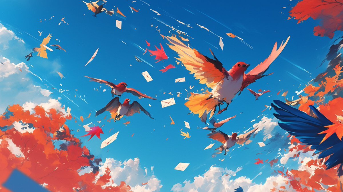 秋空をゆく、ことり郵便隊の大行進📨 真っ赤なもみじと一緒に、手紙がひらり、空に舞う。 君のもとへ届くのは、やさしい風と、ちいさな想い──🍁 #AIart #アニメ風 #秋の動物 #Midjourney #フリー素材 #木の実と森のことづて pic.x.com/SDdKmnRnUk