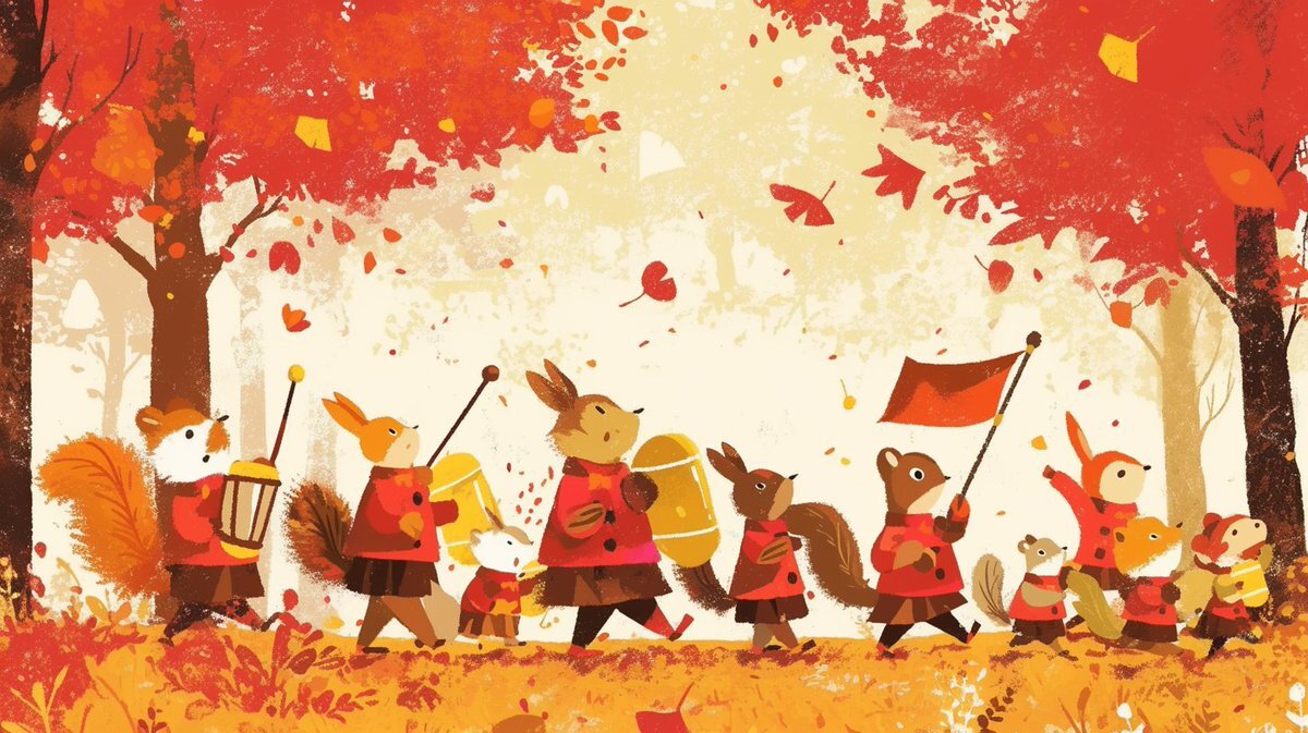 サクサクの落ち葉の上を、動物たちのパレードが行進中♪ 赤い旗に、小太鼓ポンポン、どんぐりマーチで森じゅうがにこにこに🍁 #AIart #アニメ風 #秋の動物 #Midjourney #フリー素材 #木の実と森のことづて pic.x.com/P5wGQuQq1o