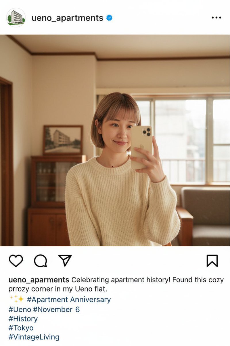 今日のFinstagram(#Gemini に作らせた架空の #Instagram です。) 今日はアパート記念日ってことでこちらです。 #AIart #AI美女 #AI美女リアル #インスタ #アパート記念日 #昨日の分 pic.x.com/3l5hKdFPqo