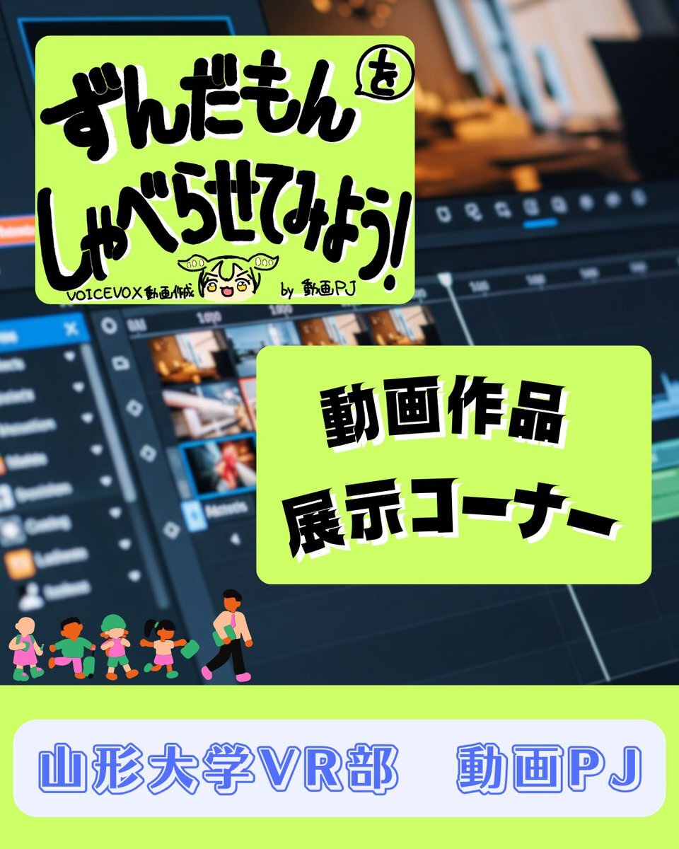 こんにちは!動画PJです。 "ずんだもんをしゃべらせようコーナー"と"動画作品展示コーナー"をやります。 ぜひ、基盤323に遊びに来てください!! #VR部 #八峰祭 #動画編集 #プレミアプロ #アフターエフェクト #YMM4 pic.x.com/aXUgHhUfGi