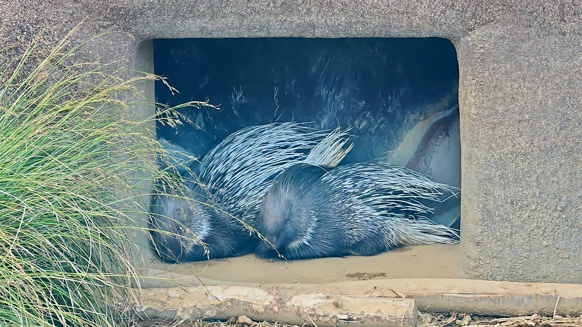 お昼頃は珍しく別々で寝ていました。 …と思ったら、リーフちゃんは目は開いていた😄(3枚目) 15時頃には最近の定位置で2頭一緒に💕 (2025.11.28) #市川市動植物園 #アフリカタテガミヤマアラシ #リーフ #ブラット pic.x.com/7l4gSYmKyg
