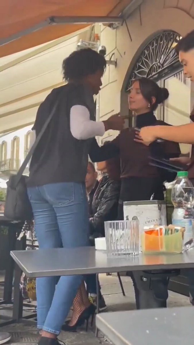 🇮🇹イタリアのカフェの店員が「他のお客さんに迷惑をかけないように」と丁寧にお願いしてたら 突如暴力を振るい始めるアフリカ系移民女性。 メローニ首相は「アフリカからの不法移民問題は1国で取り組む話ではない」と他国に呼びかけている、ほどの大問題→日本は受け入れ?