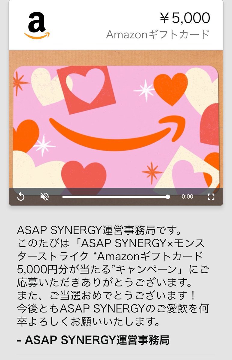 ASA PSYNERGY運営事務局@asapsynergy 様より、モンスターストライクコラボ記念キャンペーンの当選品としてAmazonギフト券5,000円分を頂きました! ありがとうございます! バンジャーイ🙌 #当選報告 #Amazonギフト券 #アマギフ #懸賞垢さんと繋がりたい pic.x.com/jL8rnCPiwQ