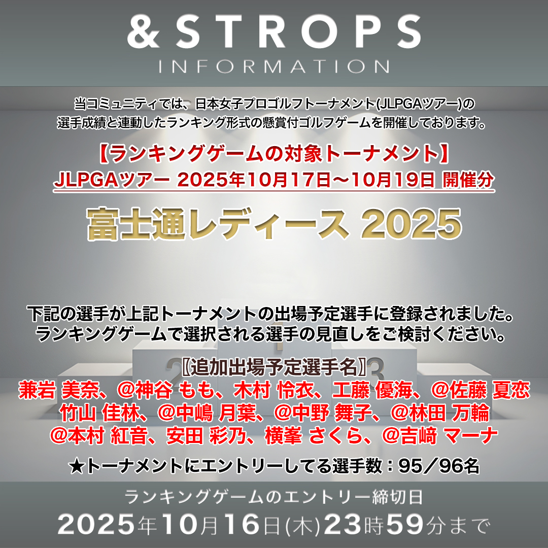 ランキングゲーム対象トーナメントのJLPGAツアー「富士通レディース 2025」において出場予定選手が追加登録されました ⇓当コミュニティへの参加方法はこちらをご覧ください⇓ strops.jp/user/static/me… #JLPGA #ゴルフ好きな人と繋がりたい #ゴルフゲーム #アマギフ #女子プロゴルフ #コミュニティ pic.x.com/xsSaXiZ7CU