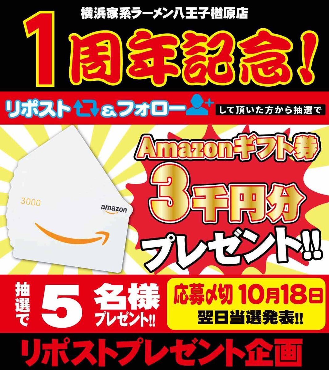 たくさんのリポストありがとうございます!! 当選発表まで残り❸日💪💪 #家系ラーメン #懸賞 #アマギフ x.com/nara_yamatoya/…
