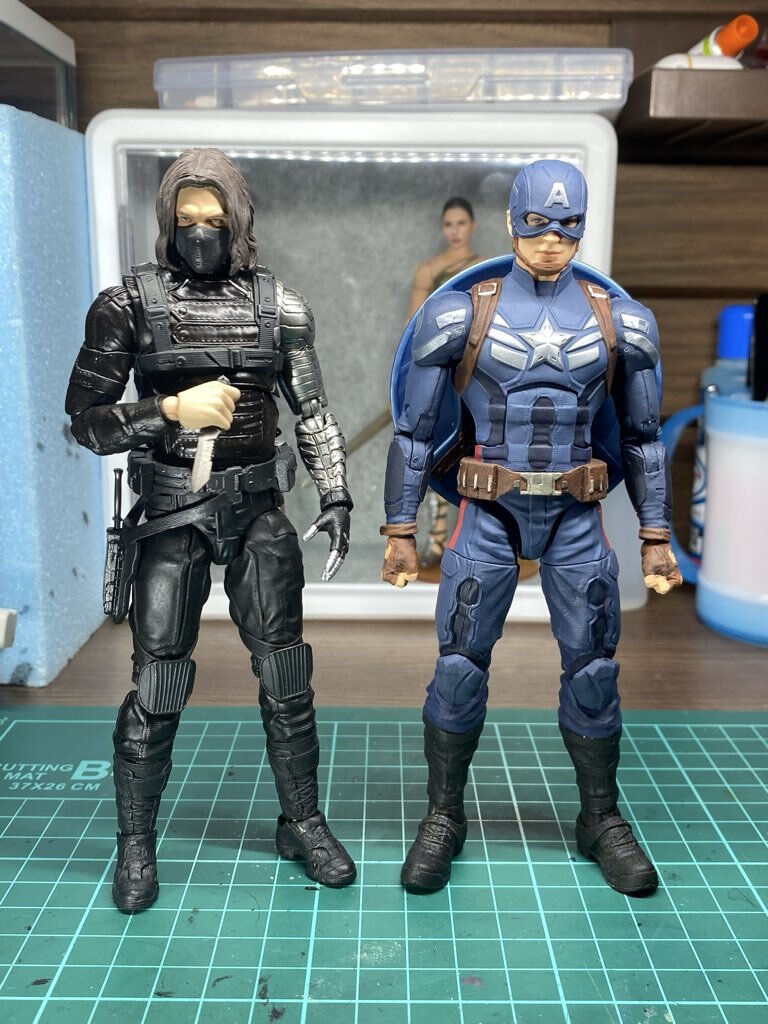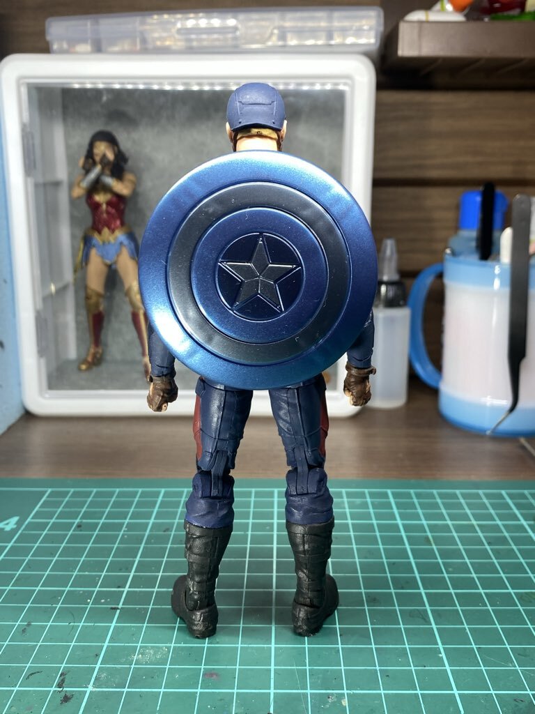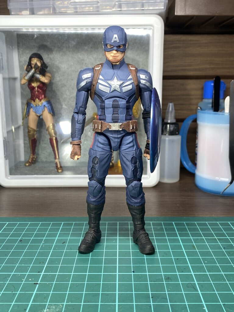 マーベルレジェンド版キャプテン・アメリカ mafex版ウィンターソルジャーと並べると少し小さく感じたので、膝から下を延長して身長を調整。 さらにコスチュームの濃い青を部分的にリペイントし、最後に艶消しトップコートで仕上げました #マーベルレジェンド #キャプテンアメリカ #アメトイカスタム pic.x.com/zA0MES1F32