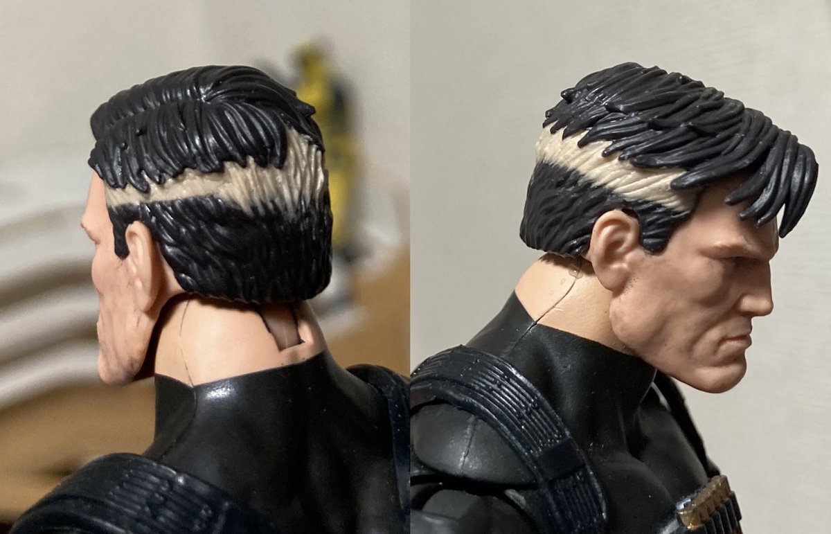 マーベルレジェンド パニッシャー ウォージャーナル2PC版 ハチマキを除去したことで足りなくなった頭髪部分を正攻法のエポキシパテで補いました ここからヤスリがけとポリパテなどで微修正をして馴染ませます #アメトイカスタム pic.x.com/LwkT8fbTDm