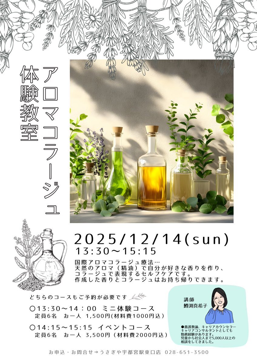 宇都宮駅東口店からお知らせ 12月14日(日)にアロマコラージュ体験教室を開催します。 好きな香りをコラージュして行うセルフケア。 コースが2種あります。 詳細は画像にてご確認ください。 ご参加お待ちしております。 #アロマコラージュ体験教室 #うさぎや宇都宮駅東口店 pic.x.com/pT5CT4k2hE