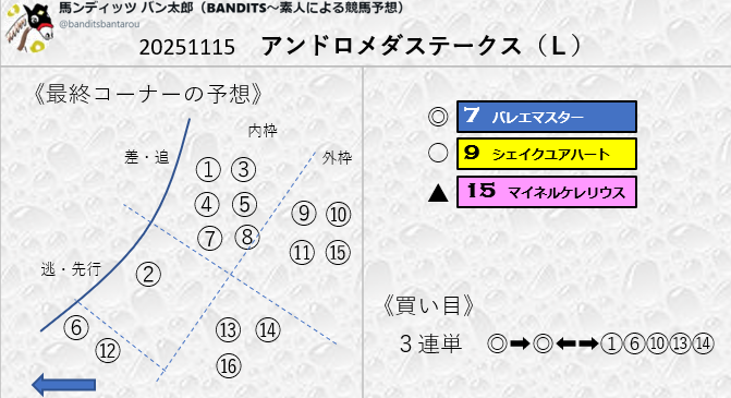 251115 #アンドロメダステークス 4コーナーで外を回しながら、という感じの馬を狙うかな😒 ⑦#バレエマスター 7人気 ⑨#カムニャック 2人気 ⑮#マイネルケレリウス 9人気 pic.x.com/1ZHUx9iGGa