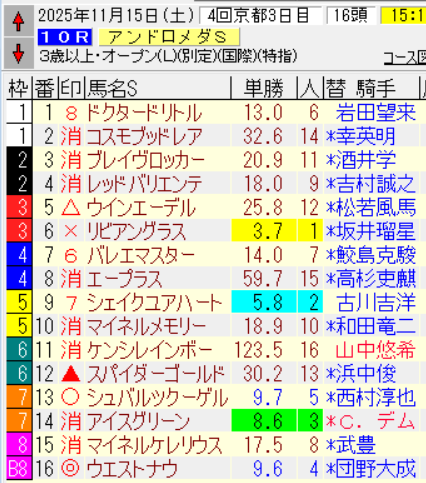 JRA #競馬予想 #全頭予想 #WIN5 2025/11/15(土) 4回京都3日目 10R #アンドロメダステークス #ドクタードリトル #バレエマスター #マイネルケレリウス #リビアングラス #シェイクユアハート #ブレイヴロッカー #アイスグリーン #レッドバリエンテ #スパイダーゴールド #シュバルツクーゲル pic.x.com/vMrxinHgVl