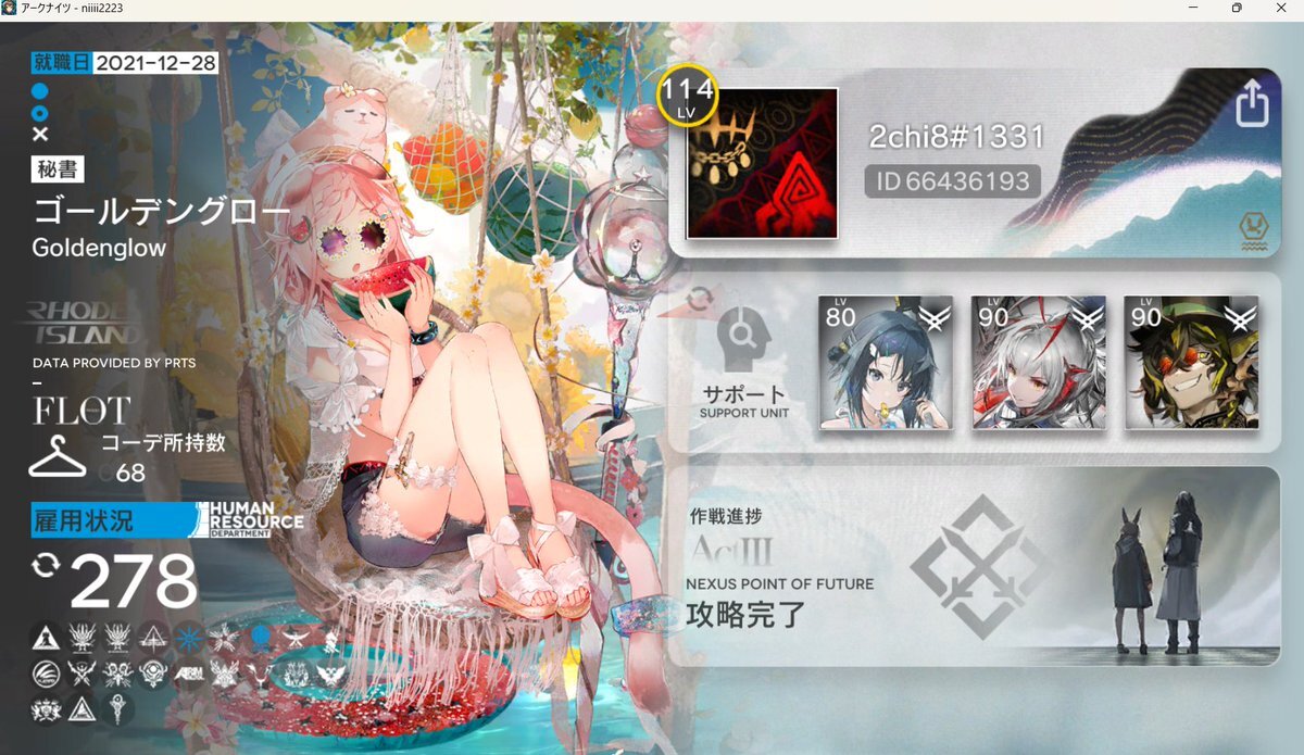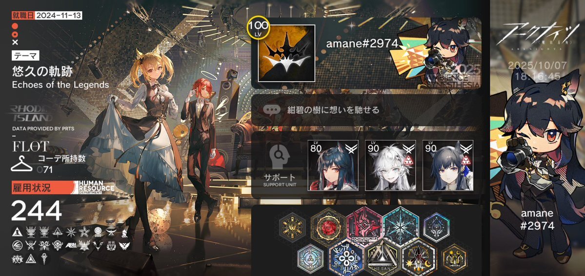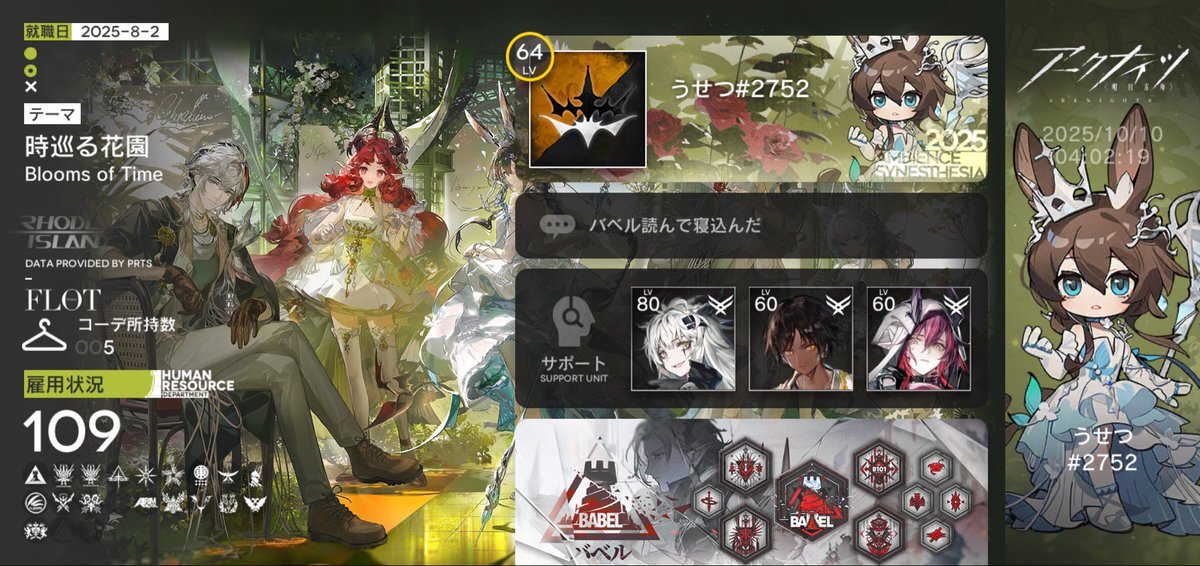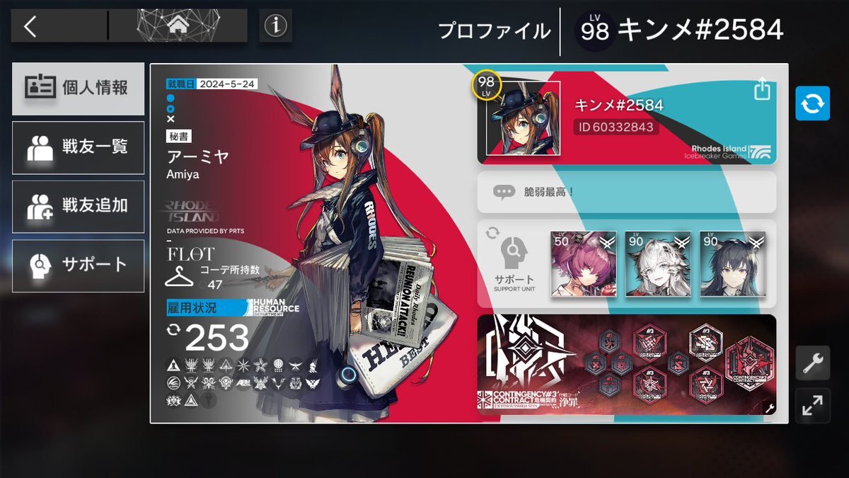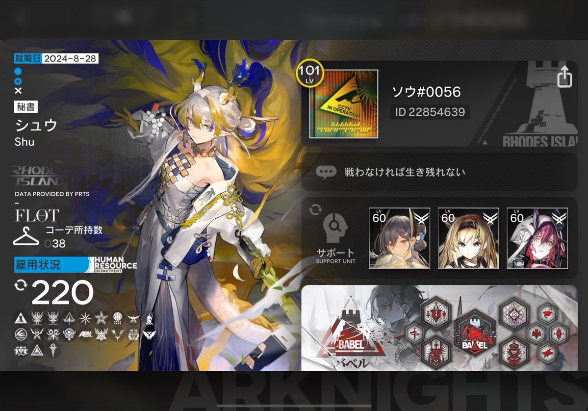 レベル100になった記念に戦友申請 ハマりすぎて半年ちょっとで全ステージ+ローグ全難易度&全END+生息演算 クリアしました。 テキラプとロスモンティス推しドクターです。 20弱程度の枠ですがなにどぞ。 #アークナイツ #アークナイツ戦友募集 #アークナイツ好きと繋がりたい pic.x.com/D1TfQBNMaK
