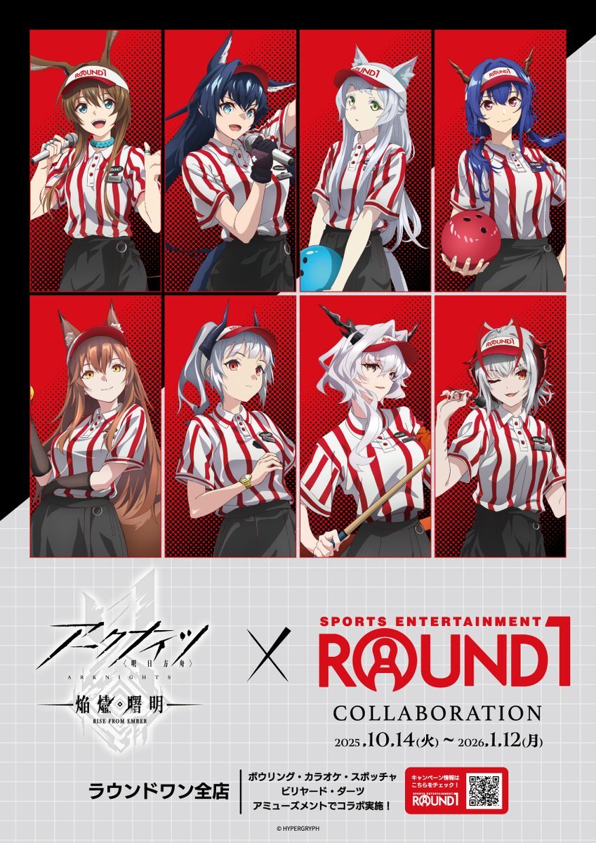 「アークナイツ【焔燼曙明/RISE FROM EMBER】× ROUND1」が2025年10月14日(火)~2026年1月12日(月・祝)で開催決定!! 描き下ろしイラストを使用したキービジュアルのほか、イベント内容を大公開! 楽しみにお待ちください! #アークナイツ #焔燼曙明 round1.co.jp/collaboration/…