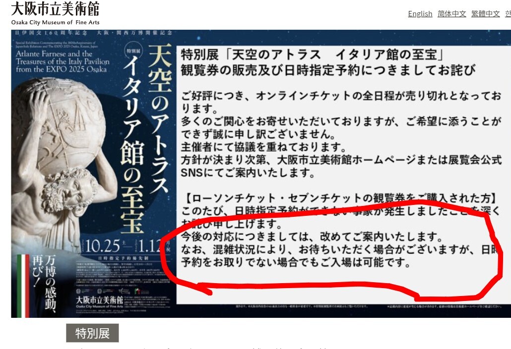 大阪市立美術館 2025.10.25~ 特別展「天空のアトラス イタリア館の至宝」 販売開始2日間で全日程売り切れてる....🤣📷 #イタリア館の至宝展 #イタリア館展 #万博イタリア展 x.com/italia_expo_te…