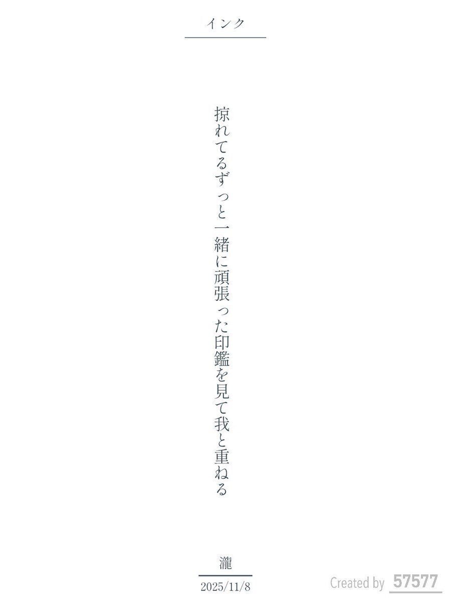 #毎日文学 #短歌 #インクをテーマに作品をつくる 掠れてるずっと一緒に頑張った印鑑を見て我と重ねる pic.x.com/xmF01z3oJJ x.com/tankazine/stat…