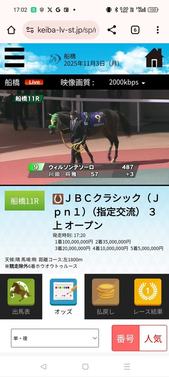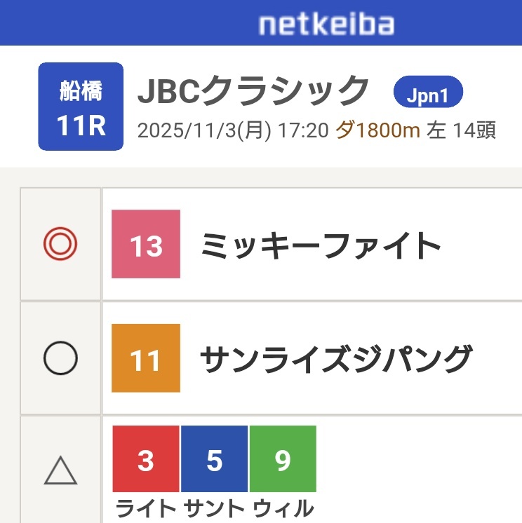 #JBCクラシック です。 現在の人気は #ミッキーファイト が1.6倍と被りました。#ウィルソンテソーロ#サンライズジパング までが10倍以下でそれに続くのが #サントノーレ。 馬体重の増減は14kg減の #メイショウハリオ くらいですがこの馬狙ってましたけど絞れてきていいじゃないの? #JBC2025