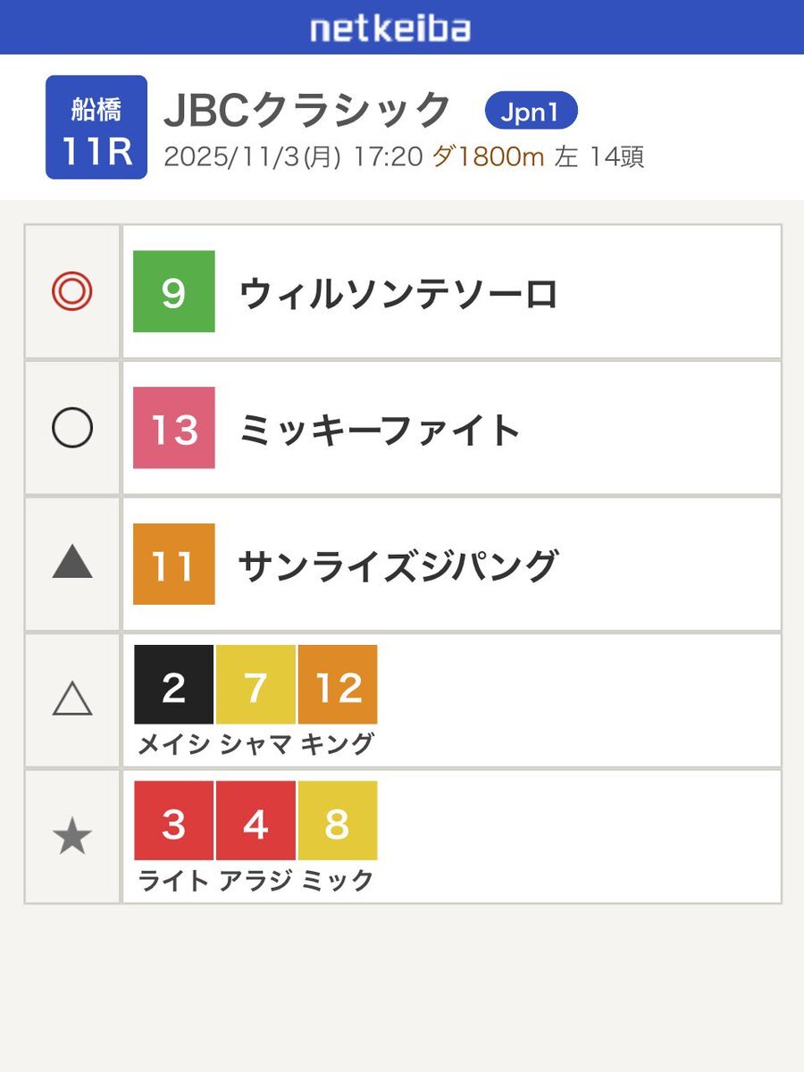 #JBCクラシック予想 変えました ◎7 #シャマル ○2 #メイショウハリオ ▲13 #ミッキーファイト 1△9 #ウィルソンテソーロ 2△8 #ミックファイア 3△5 #サントノーレ #馬単ボックス ◎が勝てば荒れますから6頭選びます。マイル前後がいい2△の状態が本当に良さそうで変更。 #JBCクラシック #JBC2025