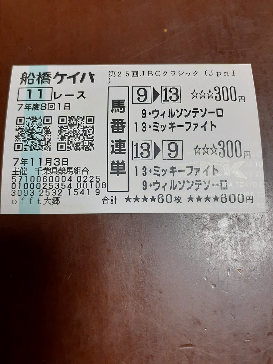 #ウィルソンテソーロ、直線失速5着かあ。◎#ミッキーファイト 頭のウィルソン2,3着の3連単しか買ってなかったんだよなあ。△#メイショハリオ は2,3着、※#サントノーレ は3着で入れてたけどなあ。ウィルソン、これはホント適正距離が短くなってしまっているのかなあ。#JBCクラシック