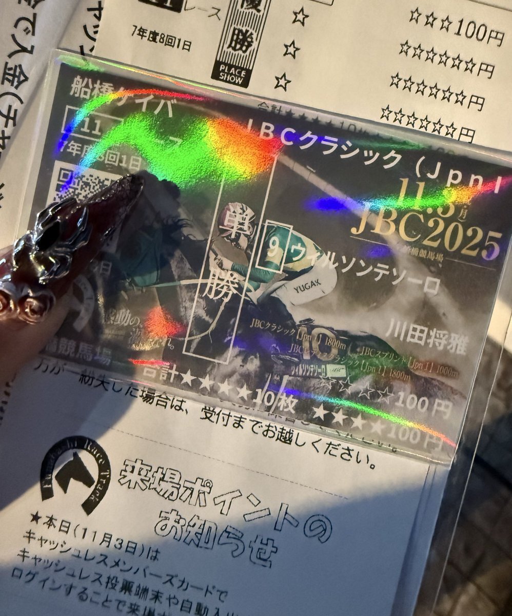 めっちゃかっこいい!システム分かってなくてお姉さんが馬券買うとこから案内して教えてくれた😭 ママコチャの紙馬券とかで出来ると思ってた😱 しかも手がかじかんでタッチパネル反応せずで押してもらってた、笑ける 介護? ウィルソンテソーロかっこいい〜!!! #ウィルソンテソーロ pic.x.com/TeeO8bVwJQ