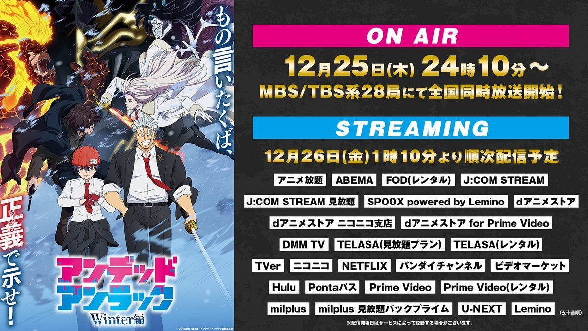 / 配信情報オープン!💥 \ 『#アンデッドアンラック』#ウィンター編❄️ TV放送直後の 12月26日(金)1:10~ 各配信プラットフォームにて順次配信開始!🔥 メインPV youtu.be/dCmNVtLsYzA #アンデラ pic.x.com/KgZbRSRM1a