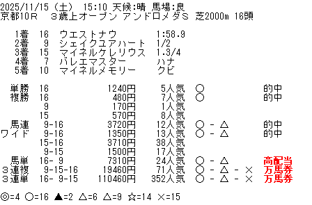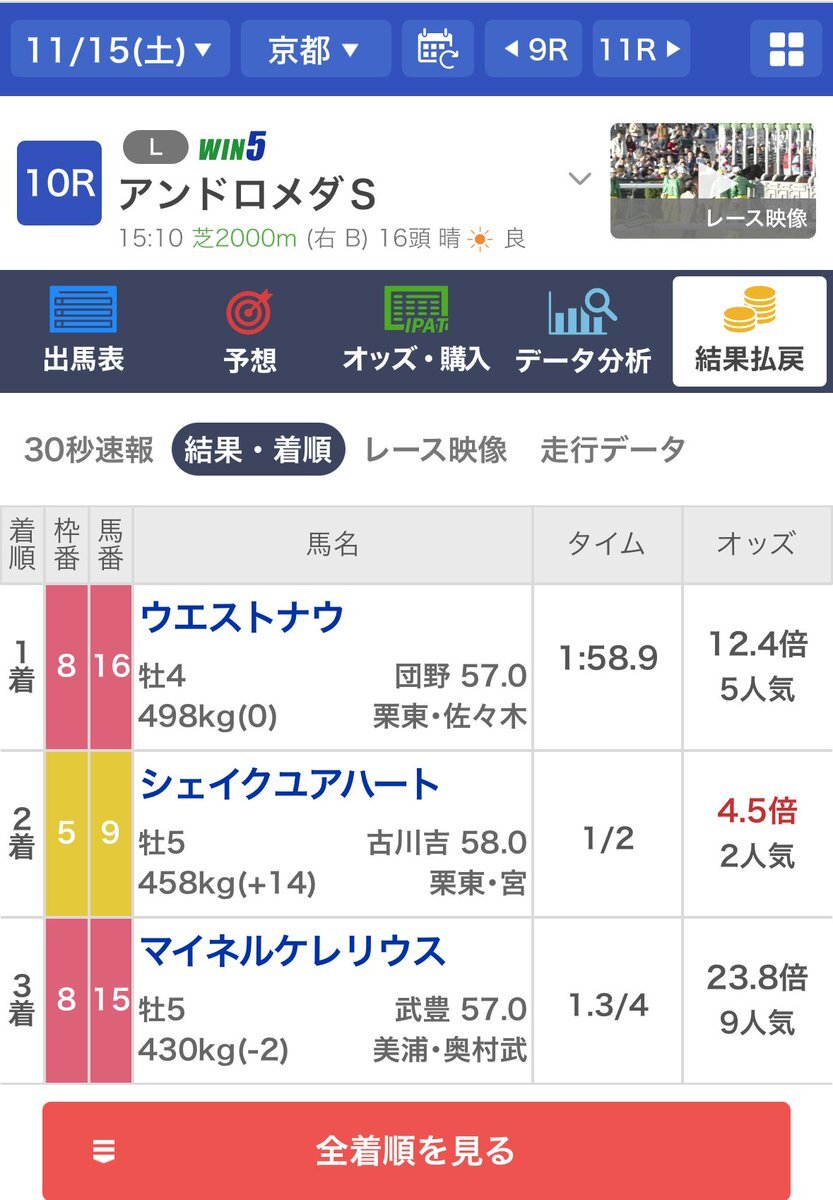 11/15 京都10レース アンドロメダステークス 🥇◎⑯ウエストナウ 🥈◯⑨シェイクユアハート 馬連 ◎◯ 37.2倍🎯 #競馬予想 #競馬 #中央競馬 #中央競馬予想 #京都競馬 #京都競馬場 #アンドロメダステークス #ウエストナウ #シェイクユアハート pic.x.com/wCQ1917Cyu