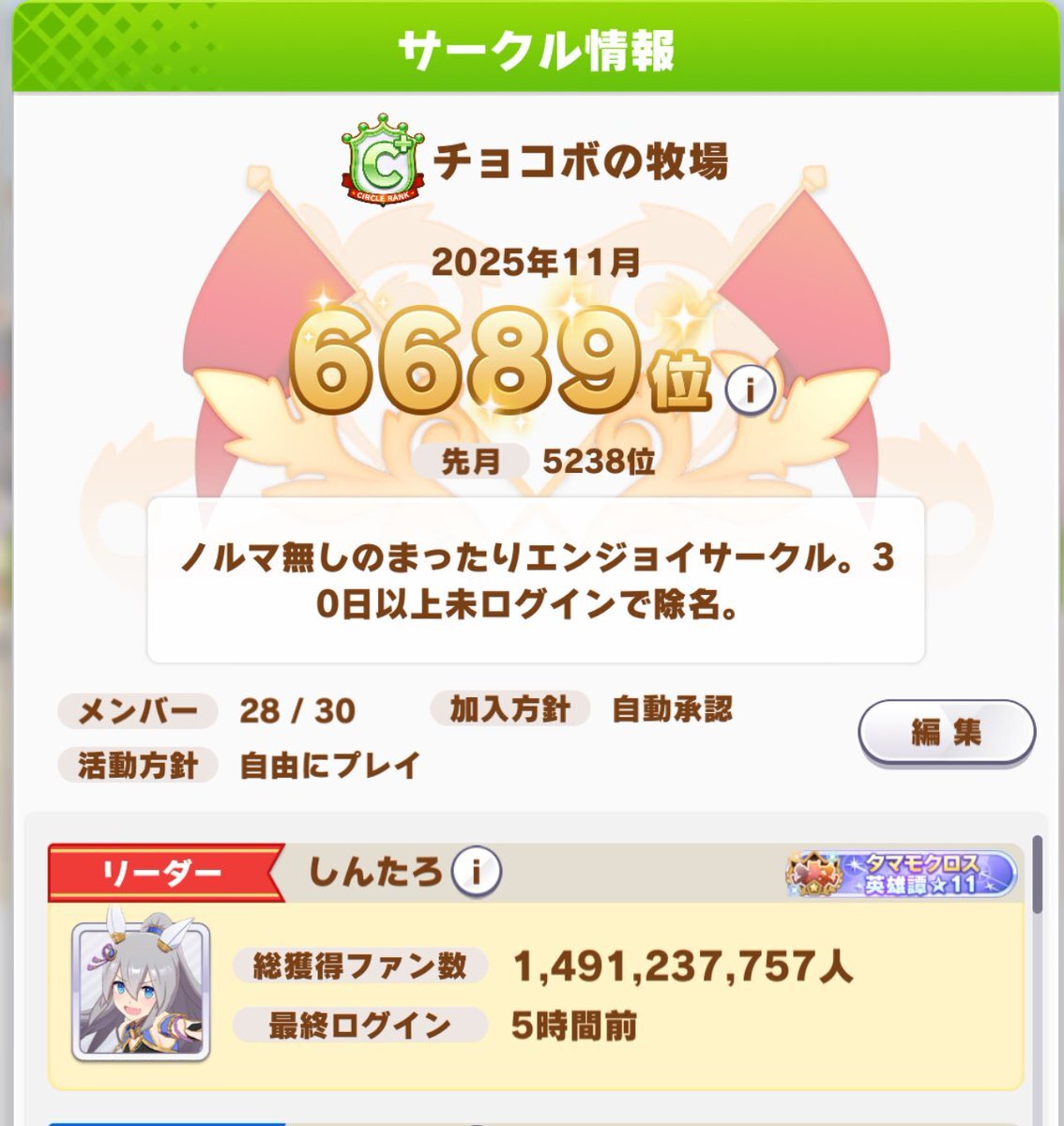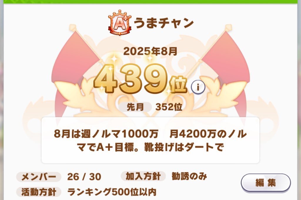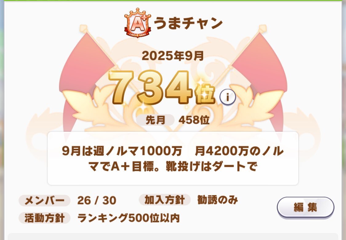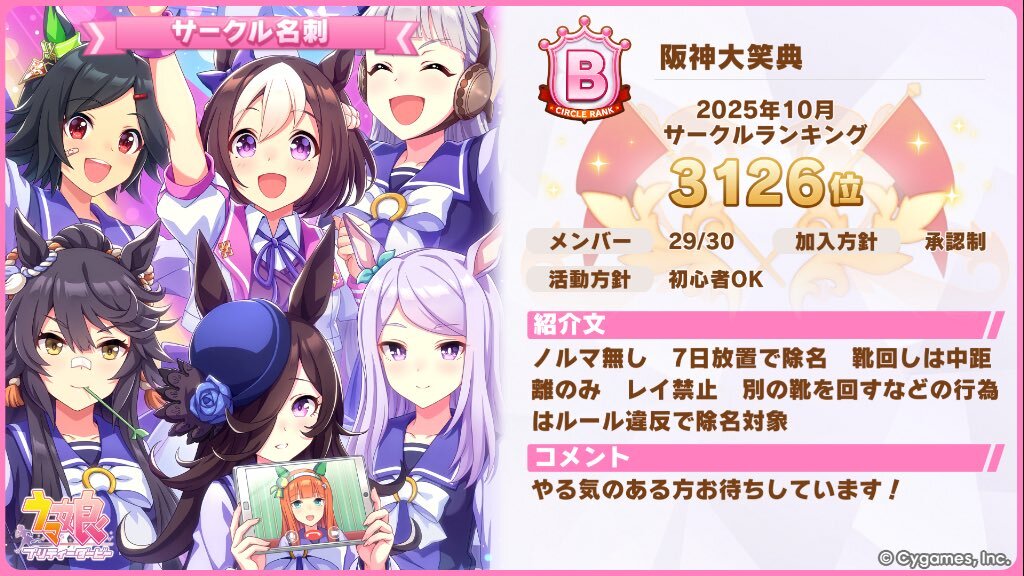 B+維持目標です。 参加していただける方募集しております。 自動育成だけでも問題ありません。 靴投げ盛んで無言OK復帰/初心者の方も大歓迎です! ご応募お待ちしております<m(__)m> #ウマ娘 #ウマ娘プリティーダービー #ゲームウマ娘 #ウマ娘サークルメンバー募集 #ウマ娘サークル勧誘 pic.x.com/cvoVdVhtKD