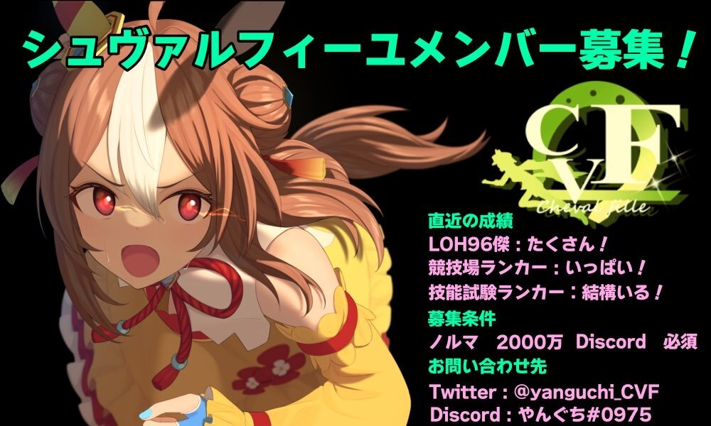 久々のサークルメンバー募集です! ノルマ→2000万(条件有 順位→114位 Discord必須(VC参加優遇) あれもこれもやりたい人にオススメです! 頻繁にVCしてます! サークル対抗戦等に出場してます! 質問あればDM下さい🙏 #ウマ娘サークル募集 #ウマ娘サークルメンバー募集 #ウマ娘サークル勧誘 pic.x.com/KAJfKxrqpJ