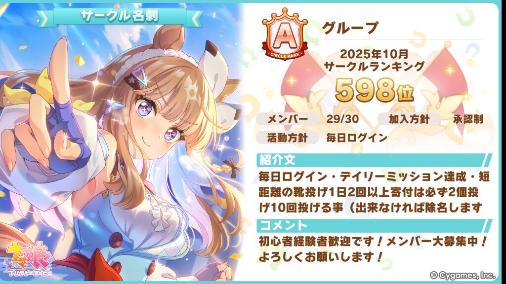 ウマ娘復帰してやる気出てきたので サークル探してます! 今月は既に1000万稼いでいるので月2000万は行くと思います。 マイペースにやっていますがそれでも宜しい方お願いします。 #ウマ娘サークル勧誘待ち pic.x.com/pdpHhvhsZB