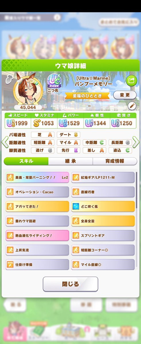 ウマ娘の競技場育成で使える 短距離の水着ゴルシ出来た! 短距離9スピード9 短距離遺伝子6(本体2) 祖父祖母フラワー&タイキ トレーナーID 867272179 #ウマ娘 #因子 #ウマ娘サークル勧誘待ち pic.x.com/ijWZF4rCZj