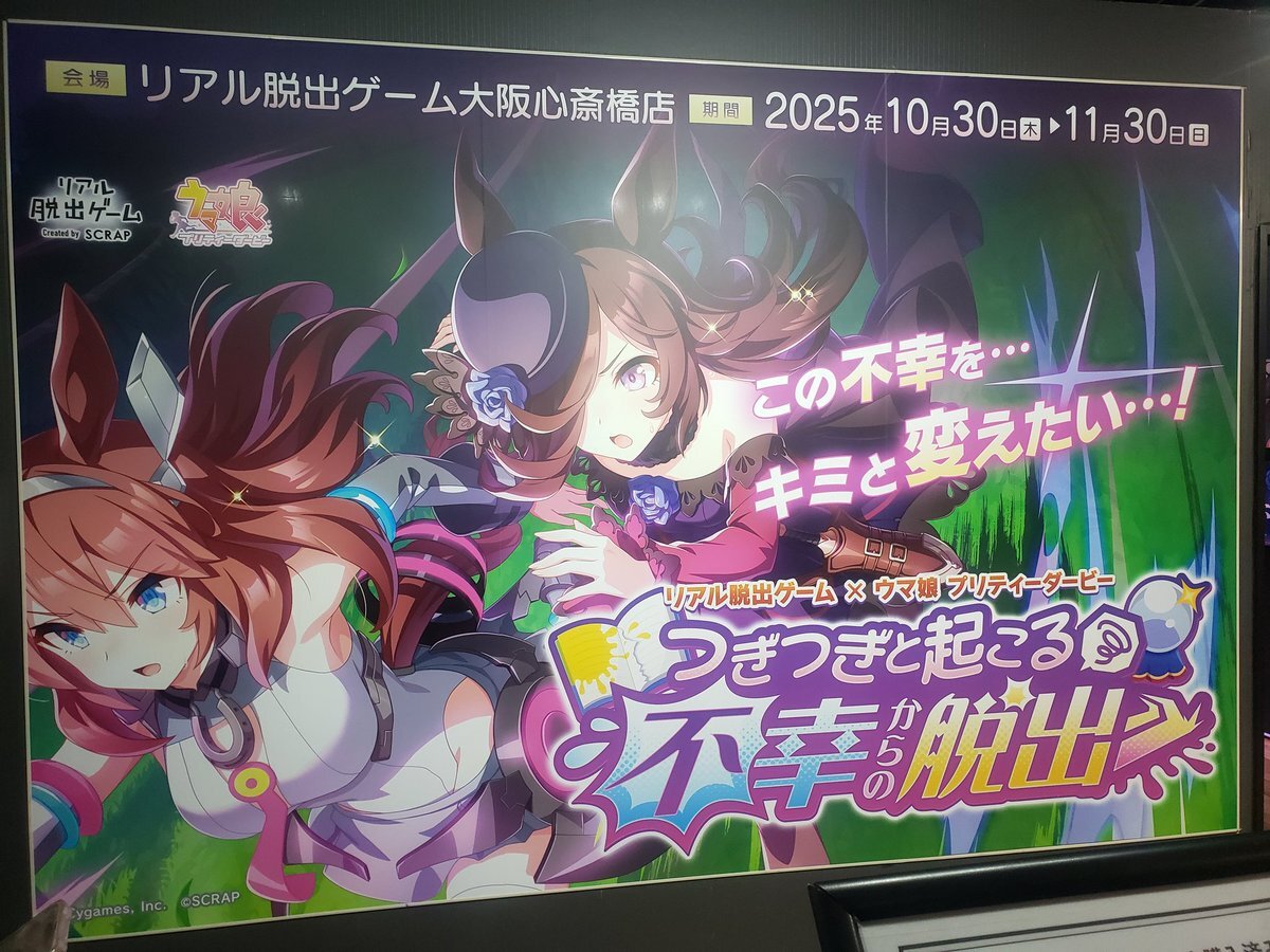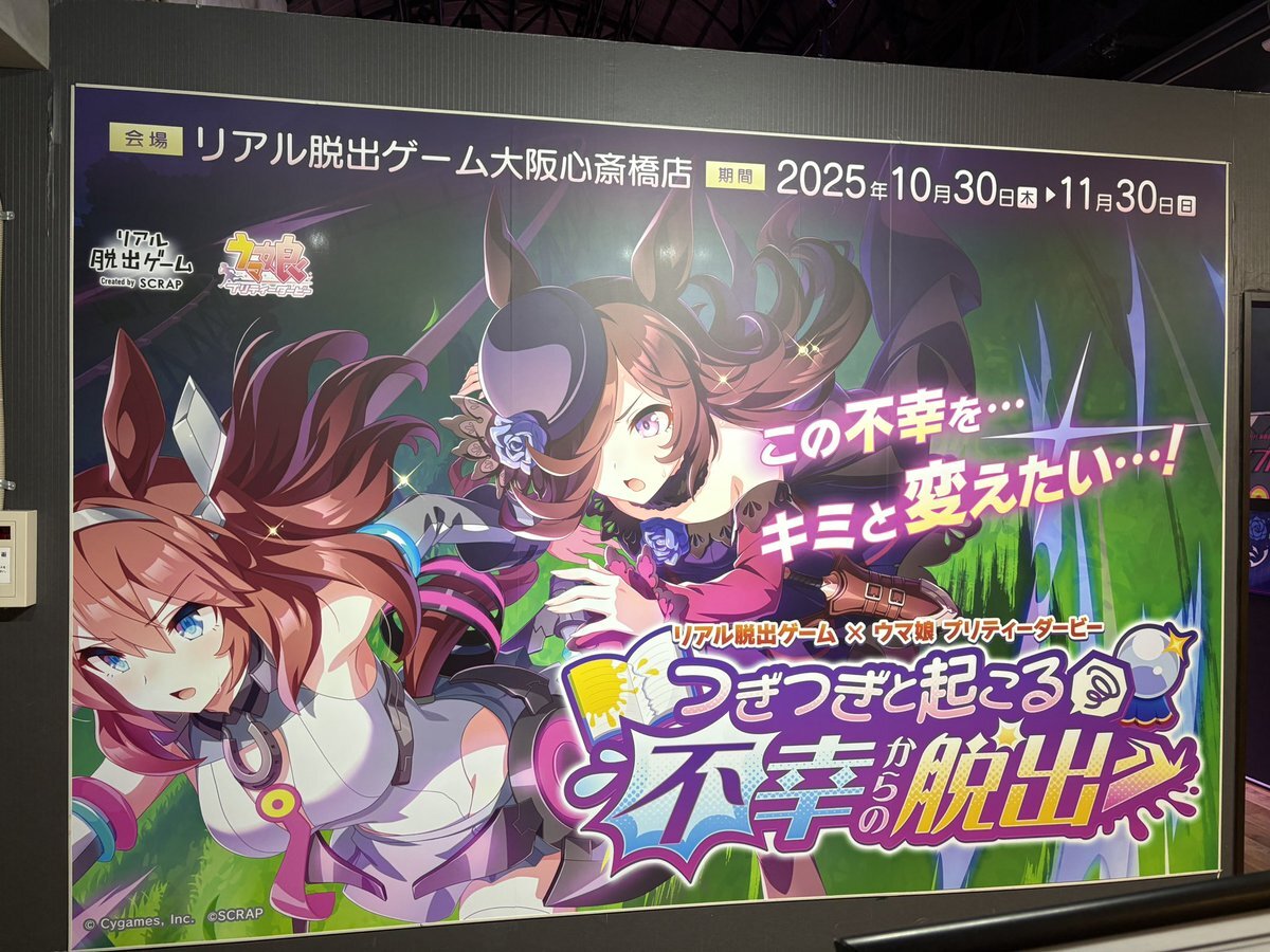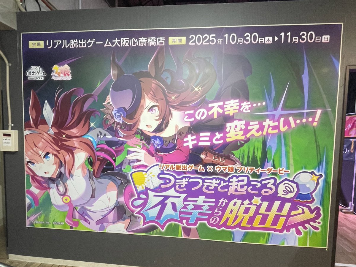 / #リアル脱出ゲーム 常設店舗 11/19(水) チケット情報🎟 明日遊べるおすすめイベントは #ウマ娘脱出2 🥕 \ #リアル脱出ゲーム大阪心斎橋 店にチケットあり🔮 つぎつぎと襲い掛かる不幸を乗り越え、ライスシャワーとともに勝利を目指せ! 詳細はこちらから scrapmagazine.com/calendar/ pic.x.com/I9JMD8sPk5