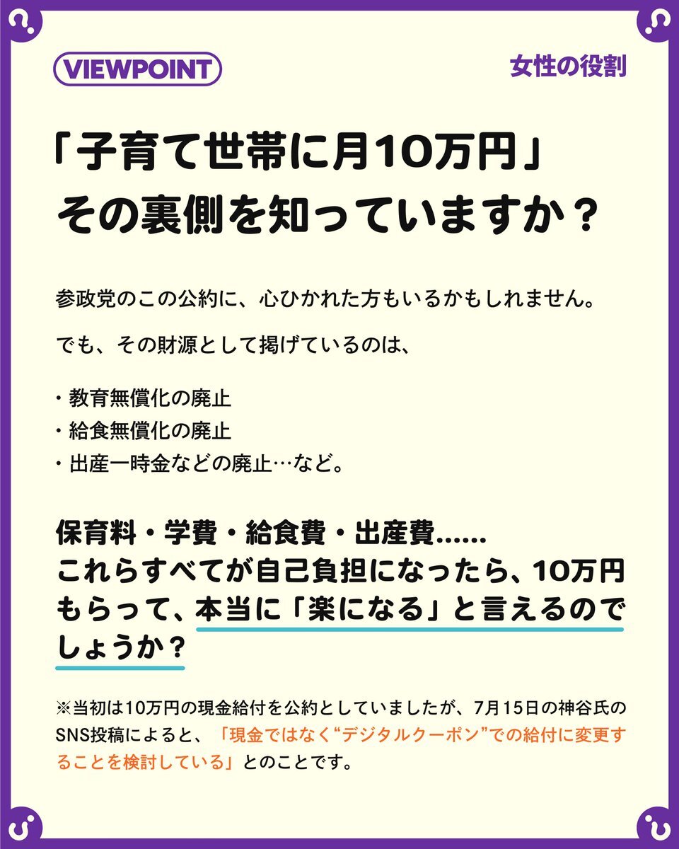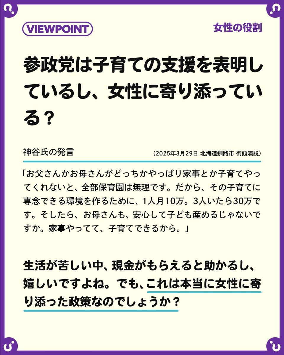 🔸参政党は子育ての支援を表明しているし、女性に寄り添っている?🔸 🔸「子育て世帯に月10万円」その裏側を知っていますか?🔸 🔸「お金がもらえる」それだけで、本当に子育ては楽になるのでしょうか。🔸 🔸男女共同参画は、間違いだったの?🔸 #ウワサの参政党 #参院選2025 #参政党 #投票へ行こう pic.x.com/SiQ5KLlTxj